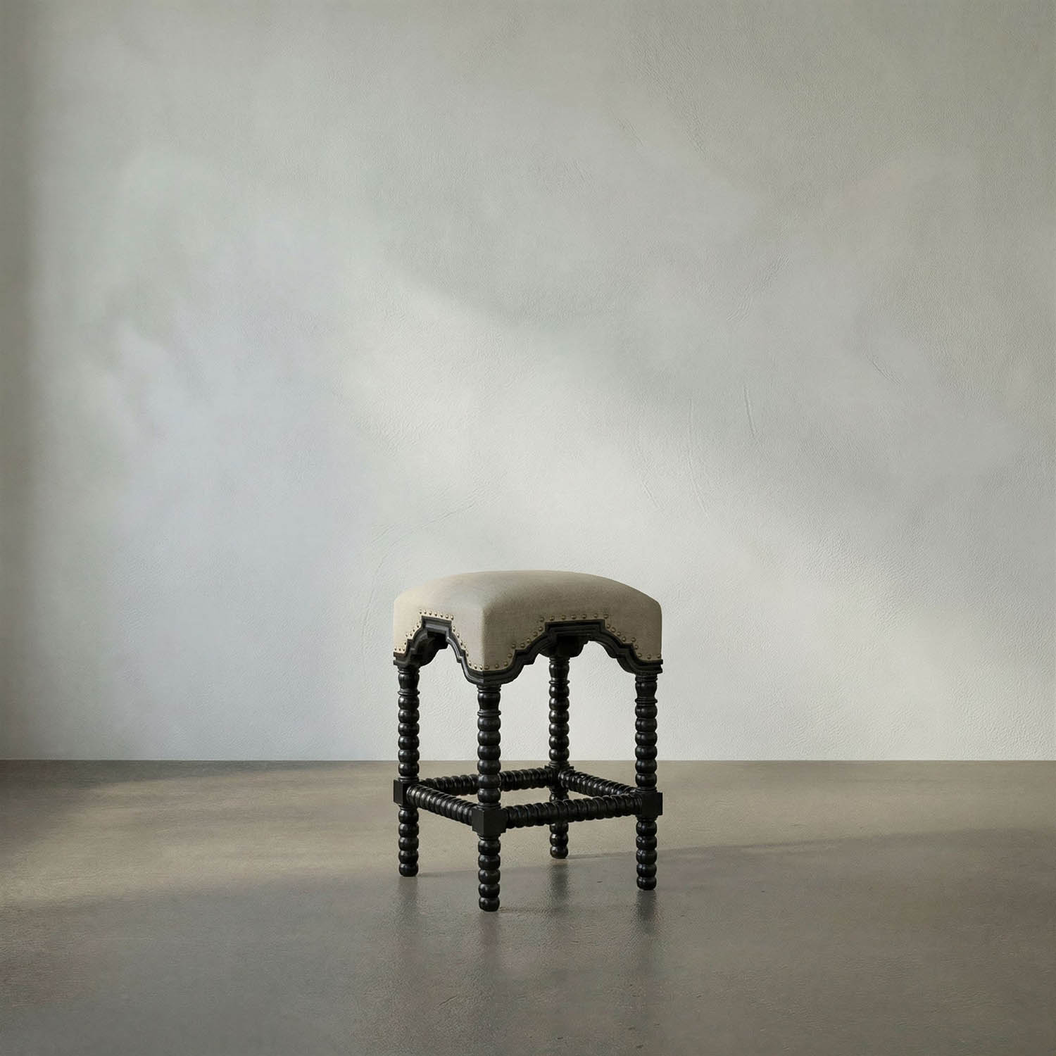 Made from turned mahogany with a hand-rubbed black finish, the Abacus Counter Stool features a classic silhouette. Its sculpted design enhances both timeless elegance and everyday functionality in kitchen islands or counter-height tables.