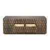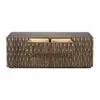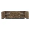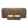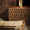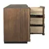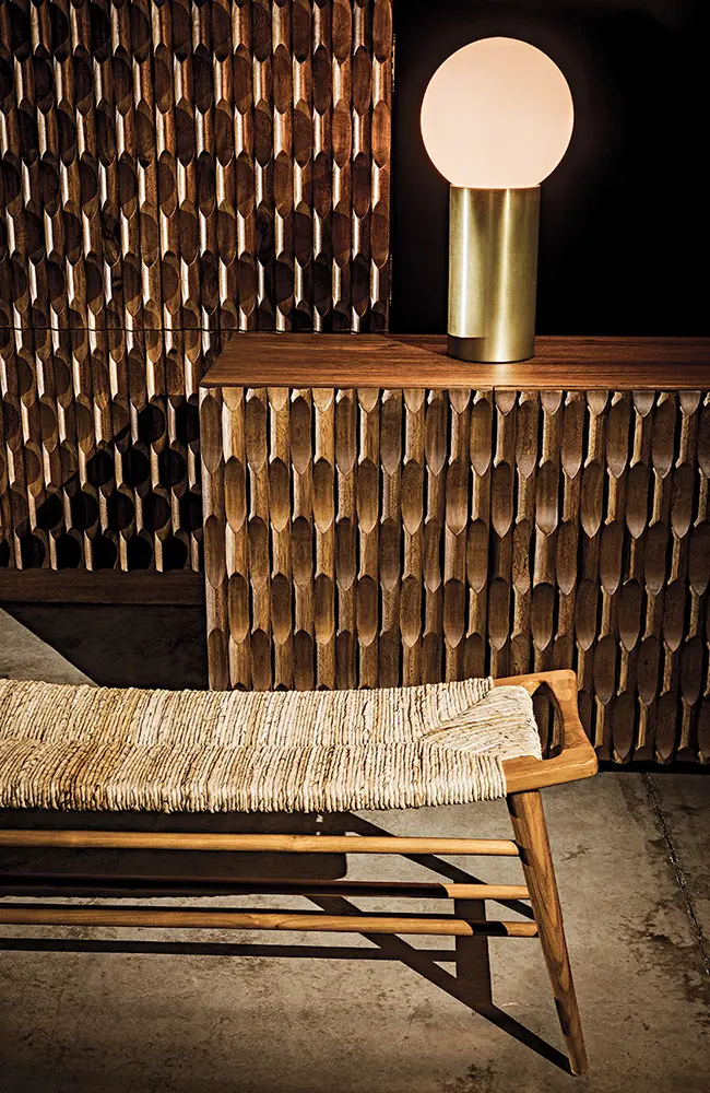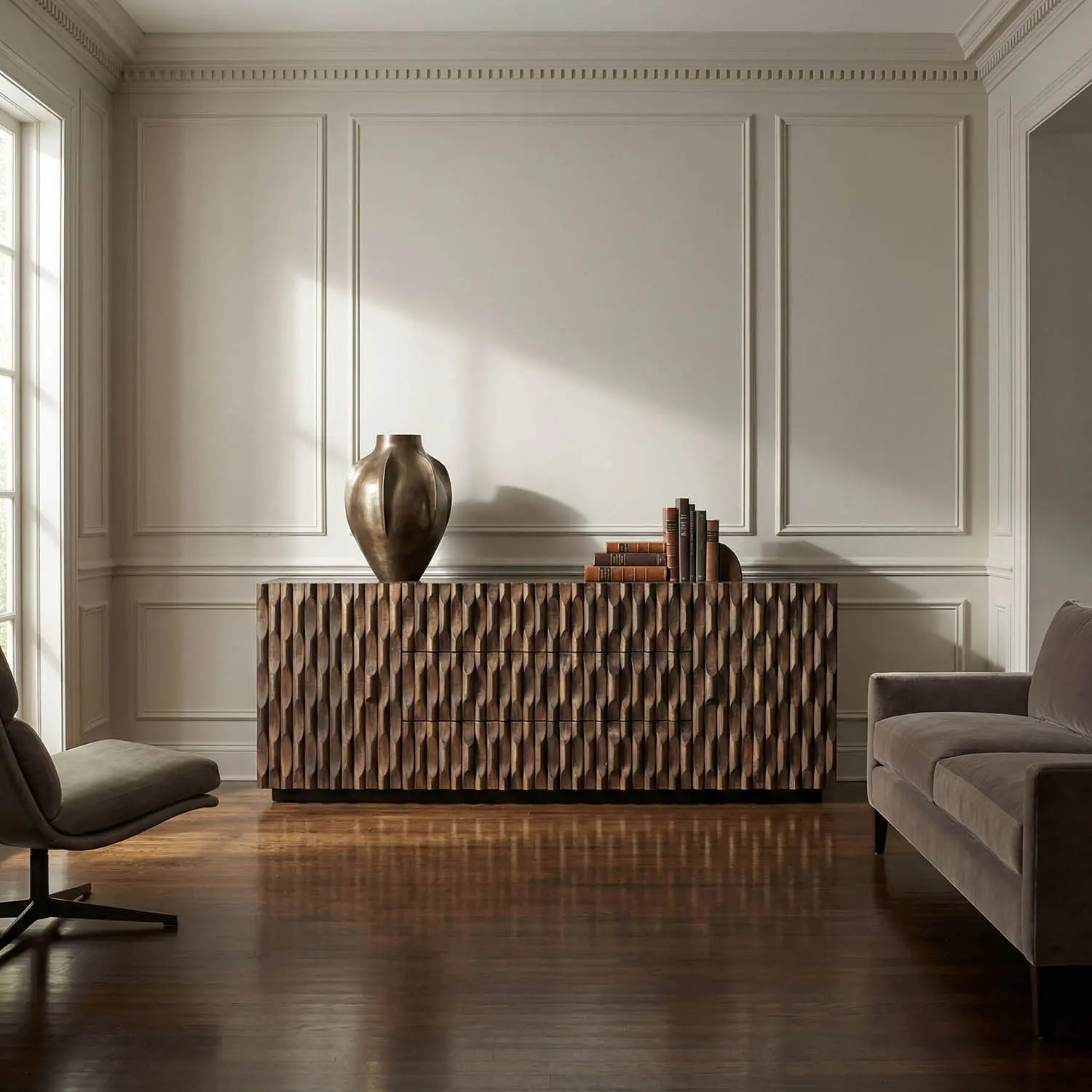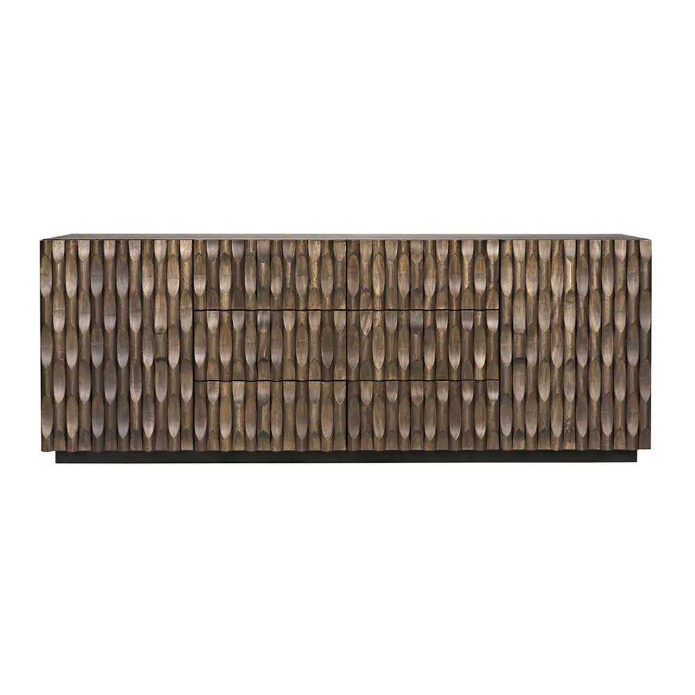 The Alemeda Sideboard features a sculpted facade of vertically carved wood, forming a wave-like texture that plays with light and shadow. Finished in rich Dark Walnut, its design artfully conceals three drawers and two doors, preserving a seamless, monolithic presence.