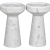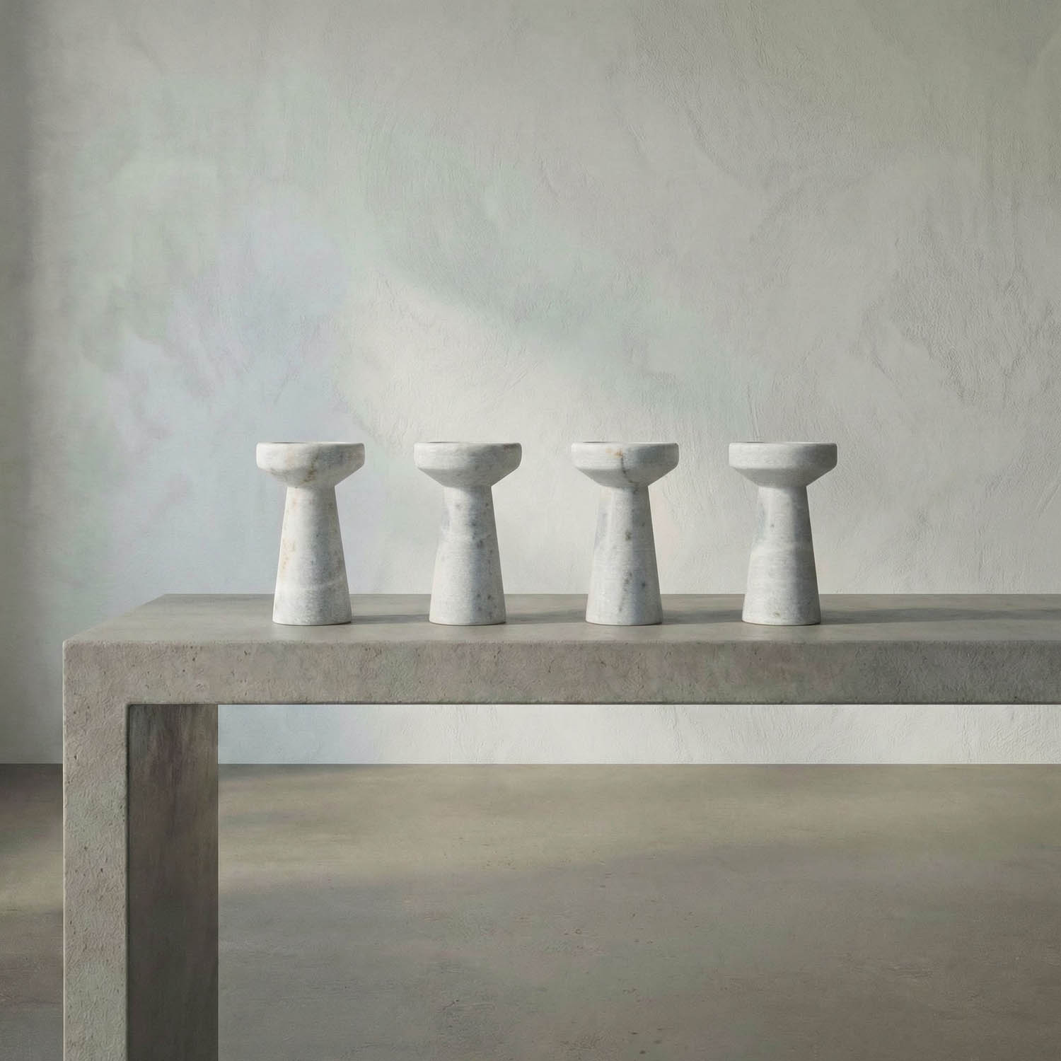 The Aleka Candle Holder set includes four hand-carved pieces made from solid white Bianco Crown marble. Each features a clean, column-like silhouette with subtle natural veining, offering a minimalist yet sculptural presence.