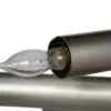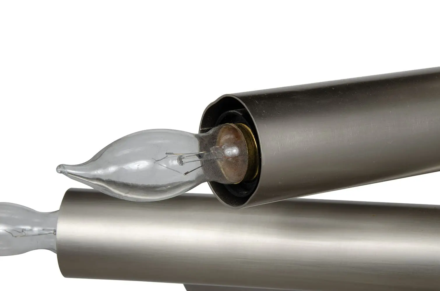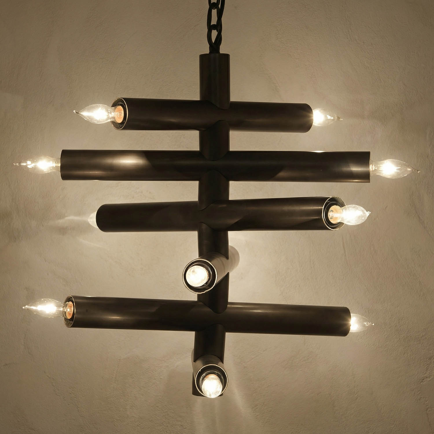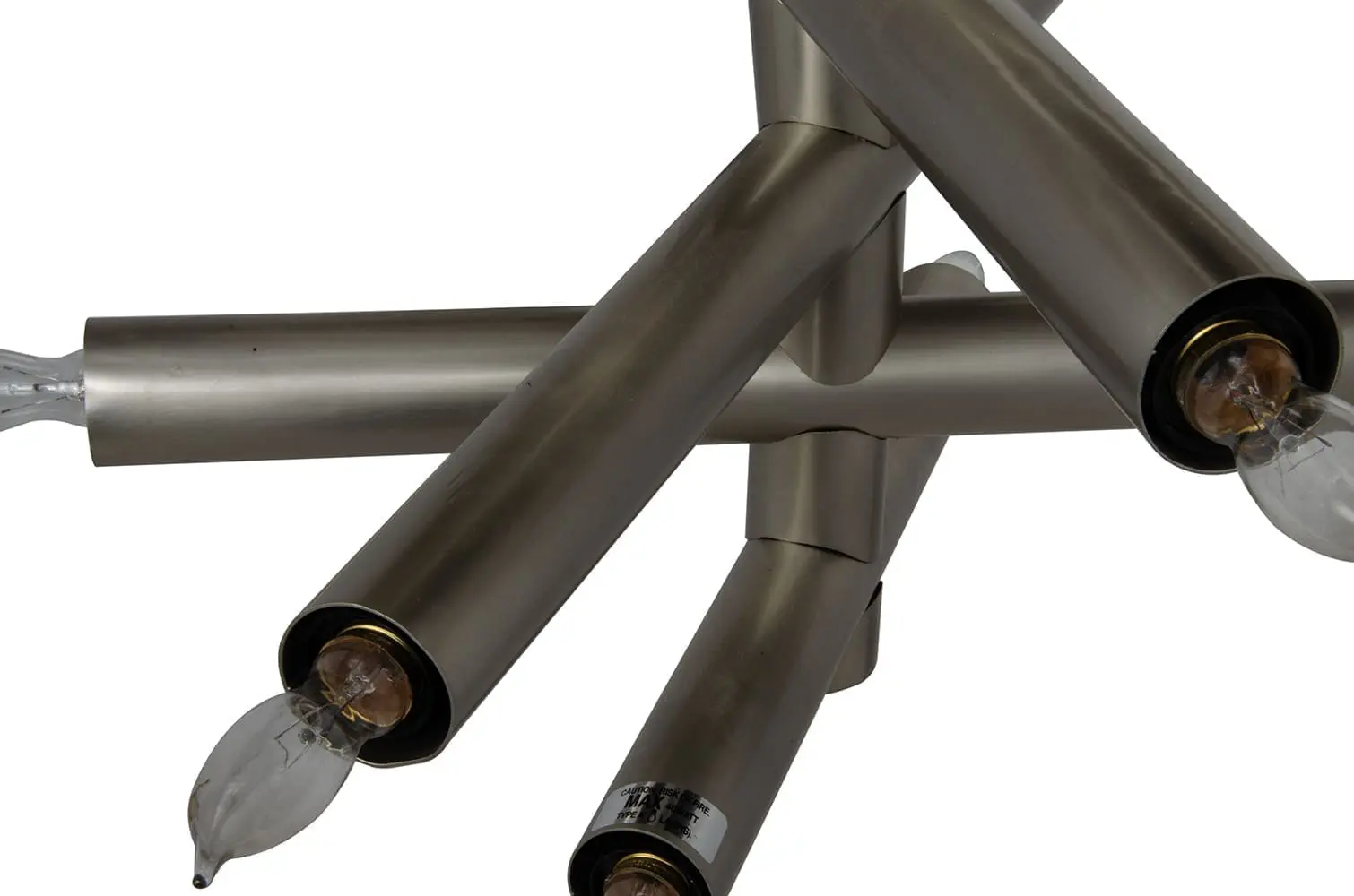 The Alex Chandelier features a burnished antique silver finish with twelve bulbs arranged in a geometric iron frame, creating a sculptural and refined focal point.