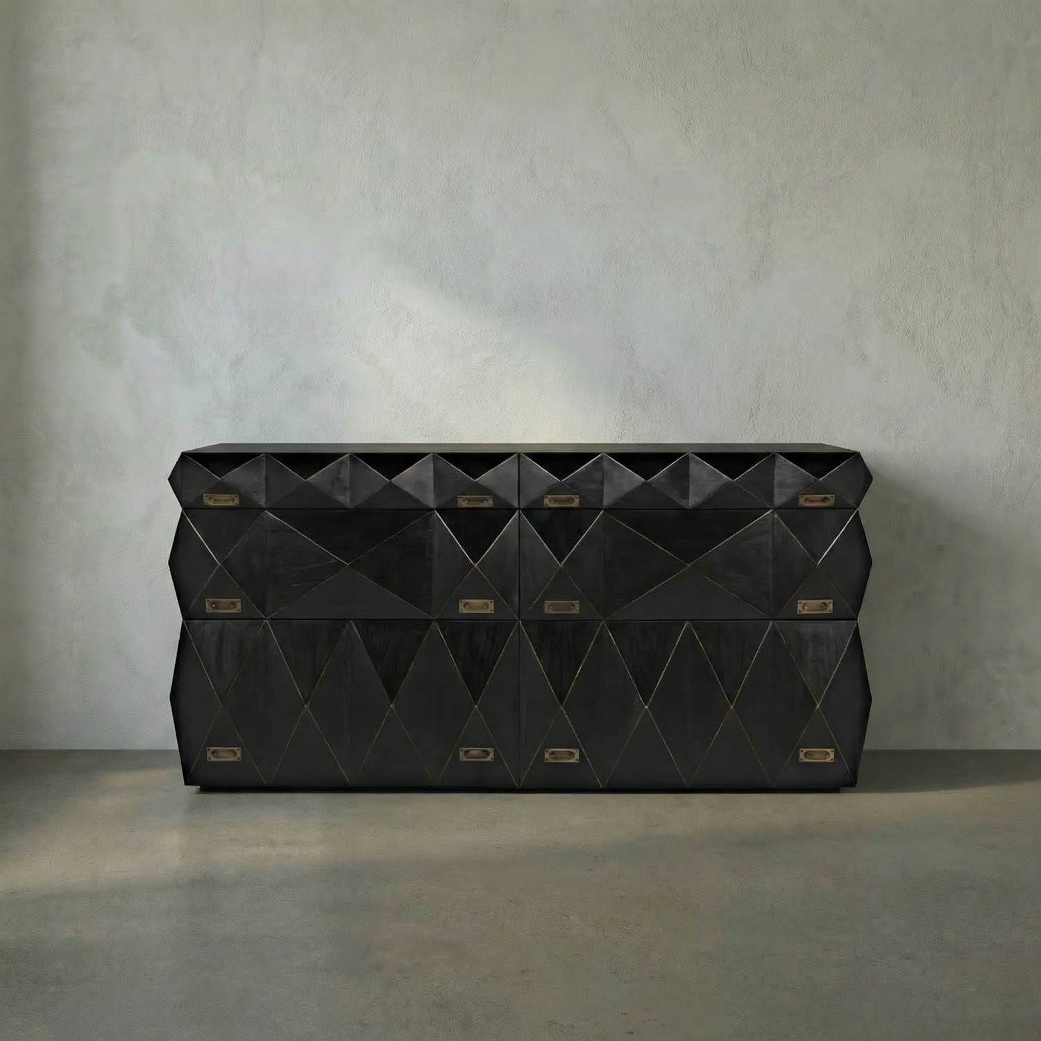 The Allegra Dresser features six faceted drawer fronts inspired by geometric patterns and gemstones. It’s Hand-Rubbed Black finish reveals warm mahogany tones, complemented by antique brass pulls for a striking look.