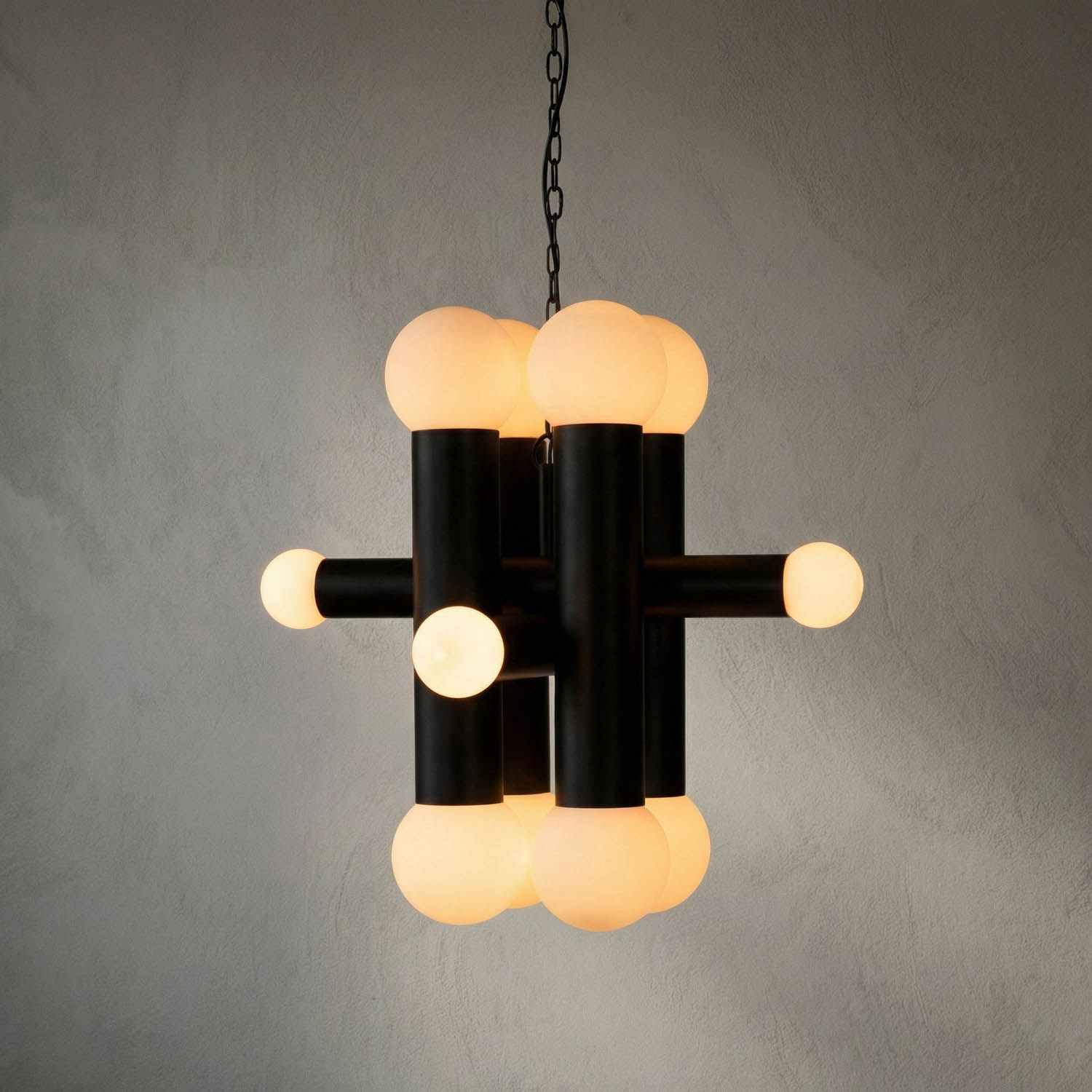 The Amadeus Chandelier features a matte black iron frame and frosted glass globes. Its large, multi-light design provides soft ambient illumination, making it a stunning centerpiece for both modern and traditional spaces.