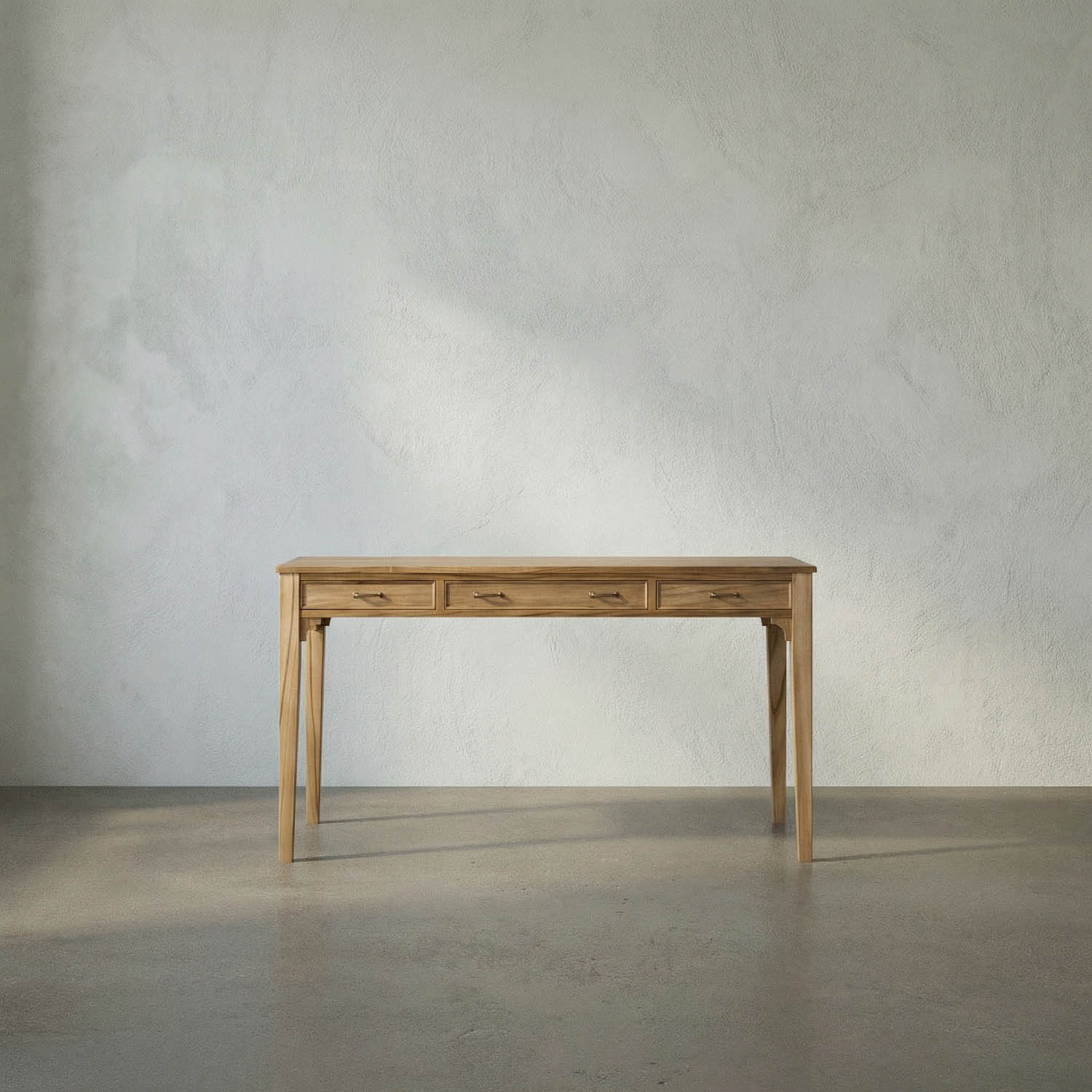 The Ambrose Desk in Teak features a classic wooden design with a warm natural finish, tapered legs, and three drawers equipped with sleek metal handles. It is both functional and elegant, making it ideal for home offices or study areas.