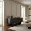 The Amidala Sideboard, finished in our two-tone Pale, features a bold, sculptural silhouette with six drawers and solid brass hardware pulls, and is framed in lightly contrasting finishes. Elevated on a geometric base, it offers refined functional storage.