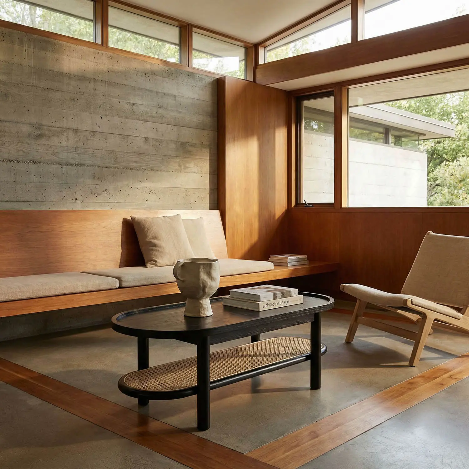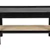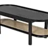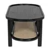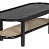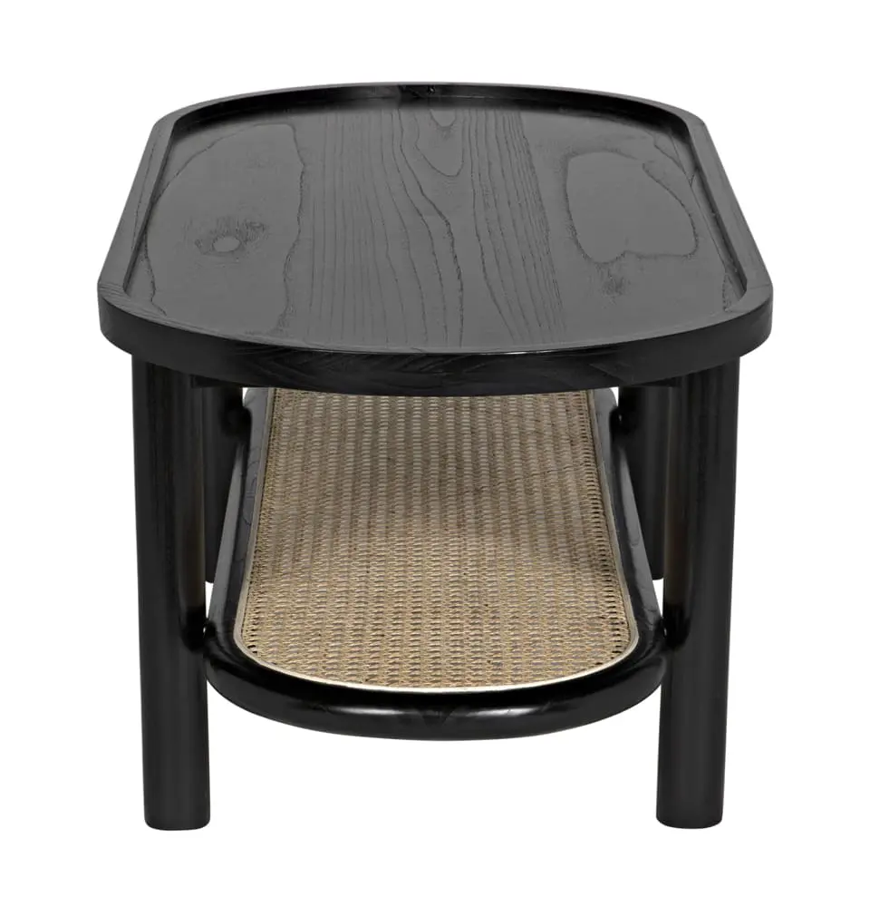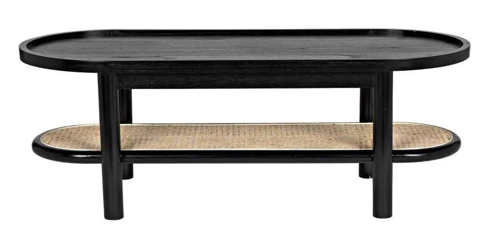 The Amore Coffee Table is a smaller-scale standout, featuring a two-tier racetrack oval with a wood top, a caned lower shelf, and dowel legs.
