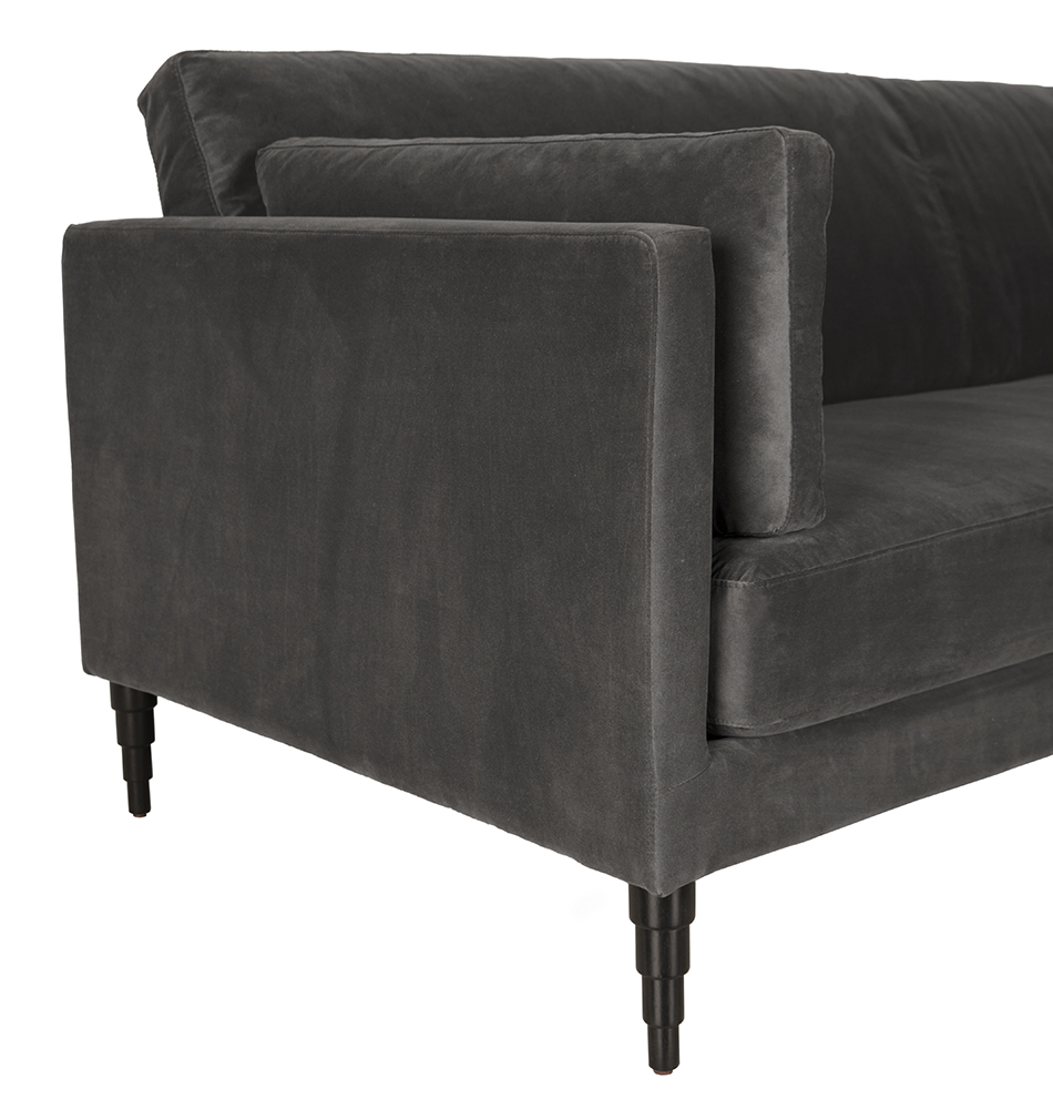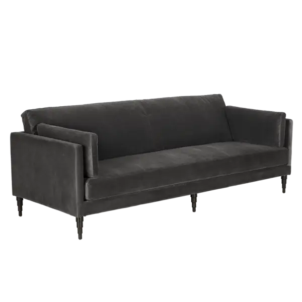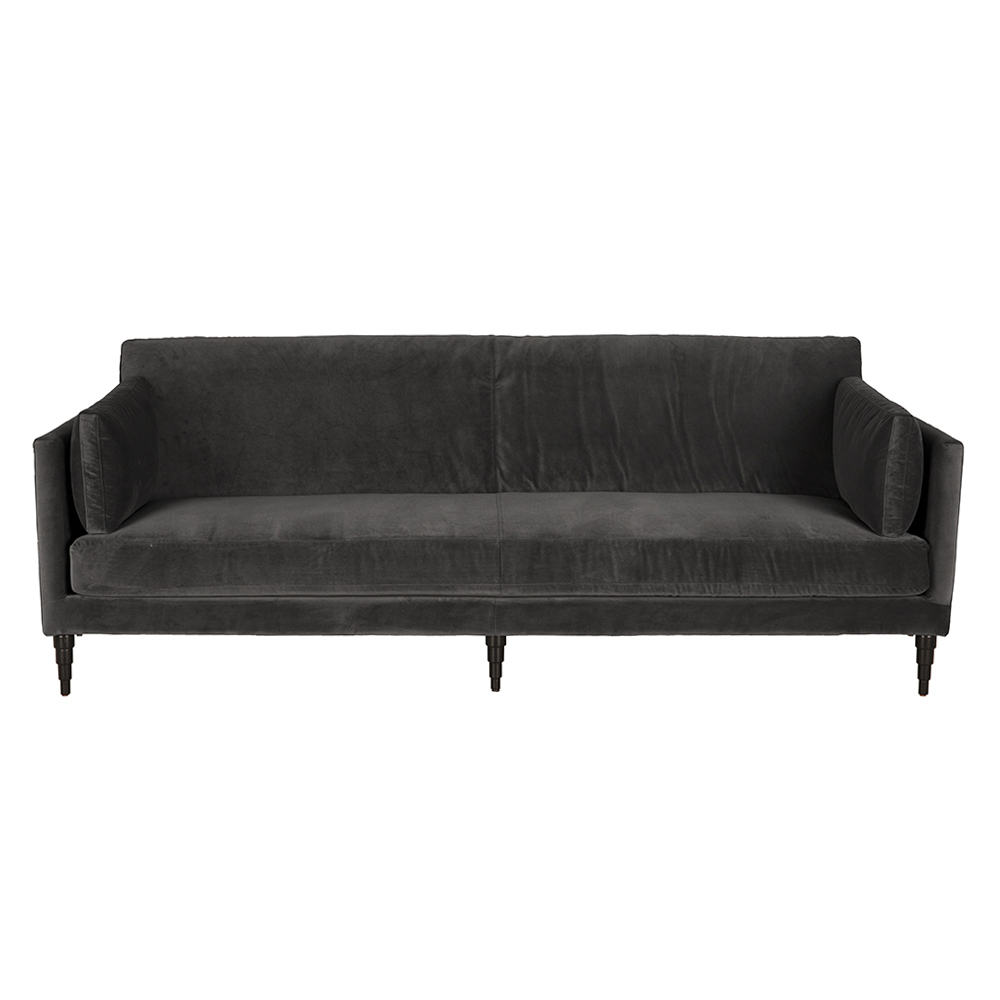 This modern three-seater sofa showcases charcoal velvet upholstery, featuring clean lines, slim track arms, and plush back cushions. It rests on elegant, turned black taper legs, lathe-carved with subtle stepped detailing for a refined, transitional silhouette.