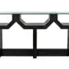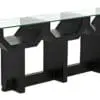 The Ando Console features a minimalist yet elegant design, showcasing a hand-rubbed black mahogany frame complemented by a smooth glass top. Its clean lines and natural wood finish make a sophisticated statement.