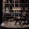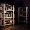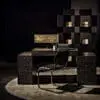 The Apollo Lamp has a perforated rectangular brass-finished body that filters light, creating a warm, patterned glow. Its design combines handcrafted elements and ornamental features with a modern edge.