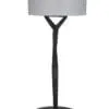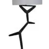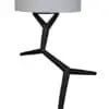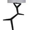 The Arizona Lamp features a modern, organic, and sculptural design. It has a matte black finish and an asymmetrical base with faceted, branch-like forms, while a white drum shade adds contrast and softness.