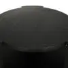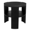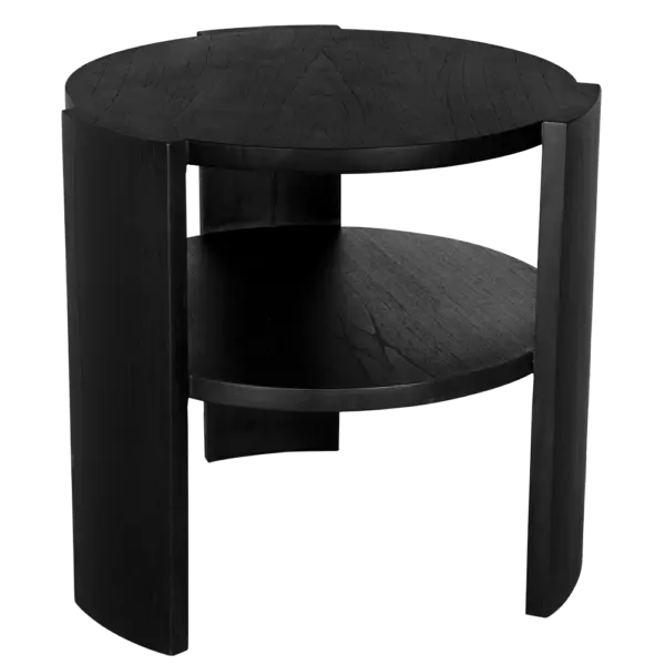 This table has a circular silhouette with sculptural, curved legs and a lower shelf for added functionality. Made from wood finished in Charcoal Black, its minimalist design and architectural lines exude modern sophistication and balance.