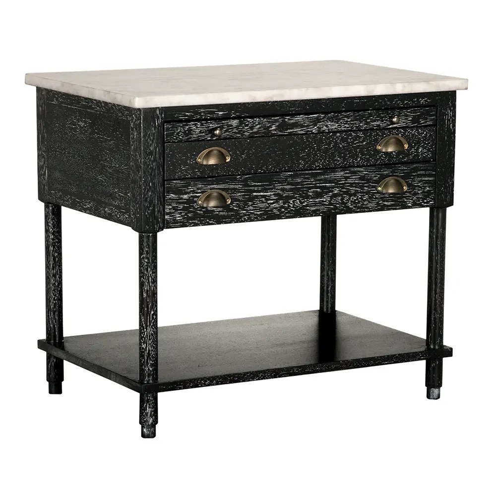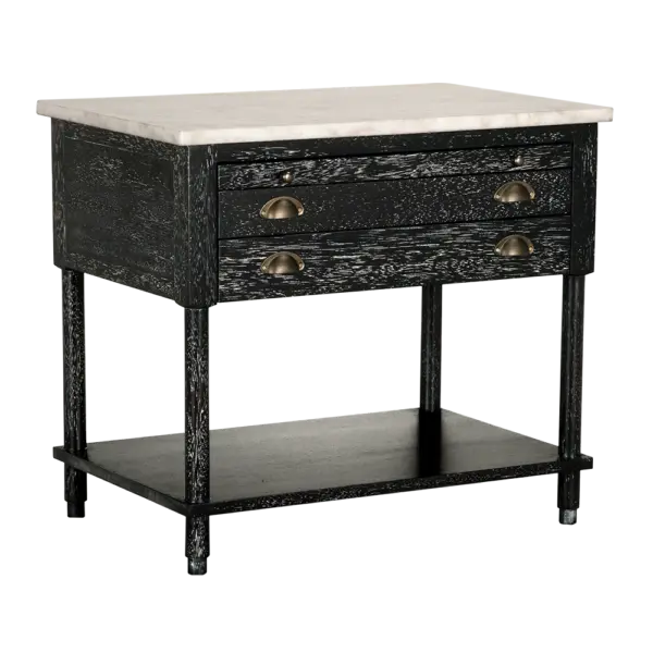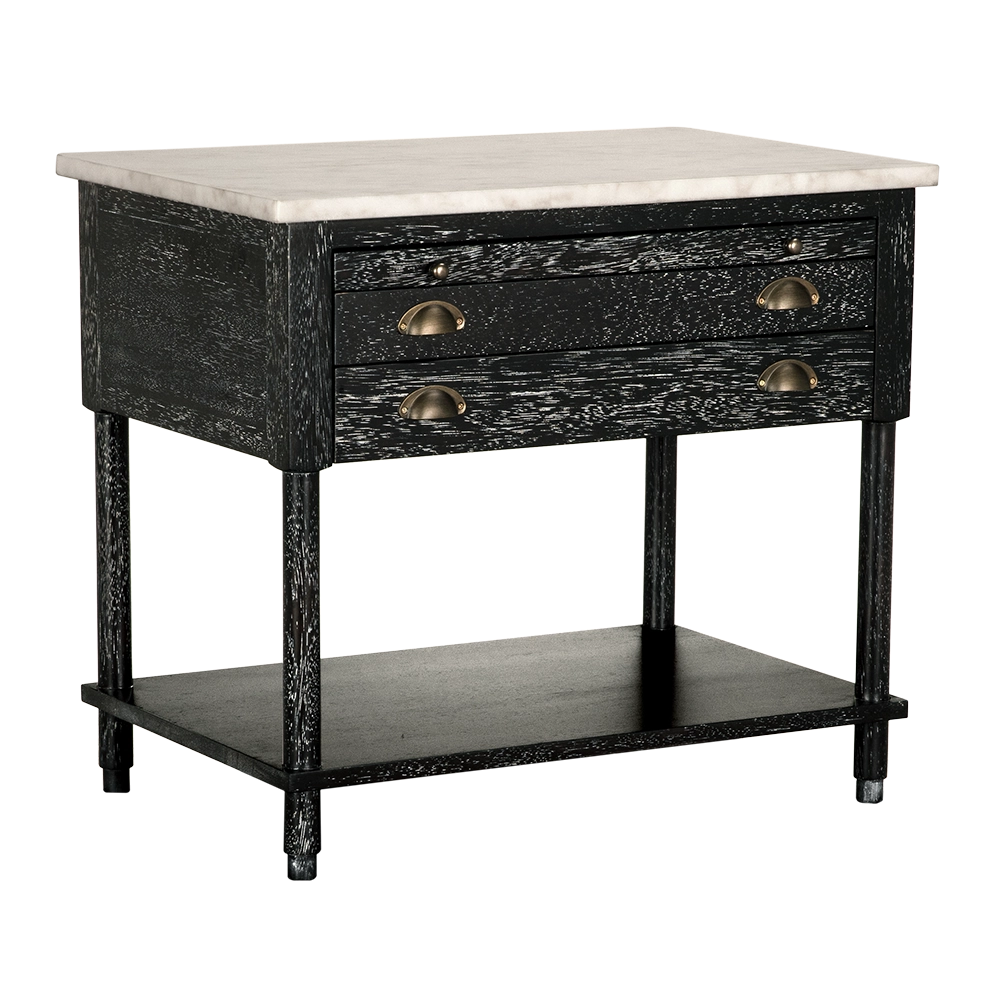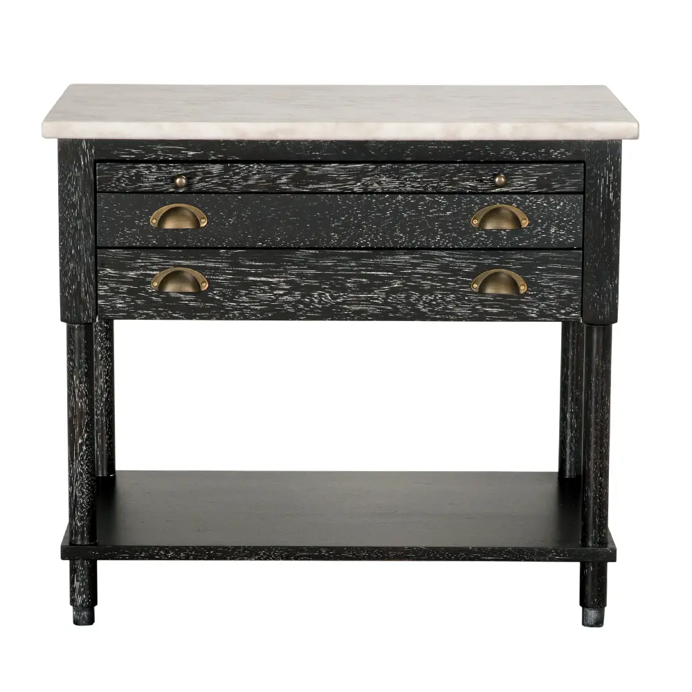 A transitional cerused black side table featuring a marble top with two drawers and a pull-out writing tray. Timeless brass accents and rich textural contrast lend versatility to any interior setting.