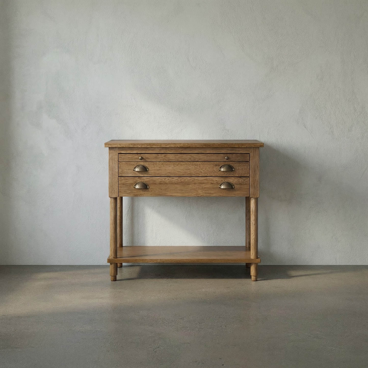 A transitional side table with a dark walnut finish features two drawers and a pull-out writing tray. Timeless brass accents and rich textural contrasts lend versatility to any interior setting.