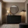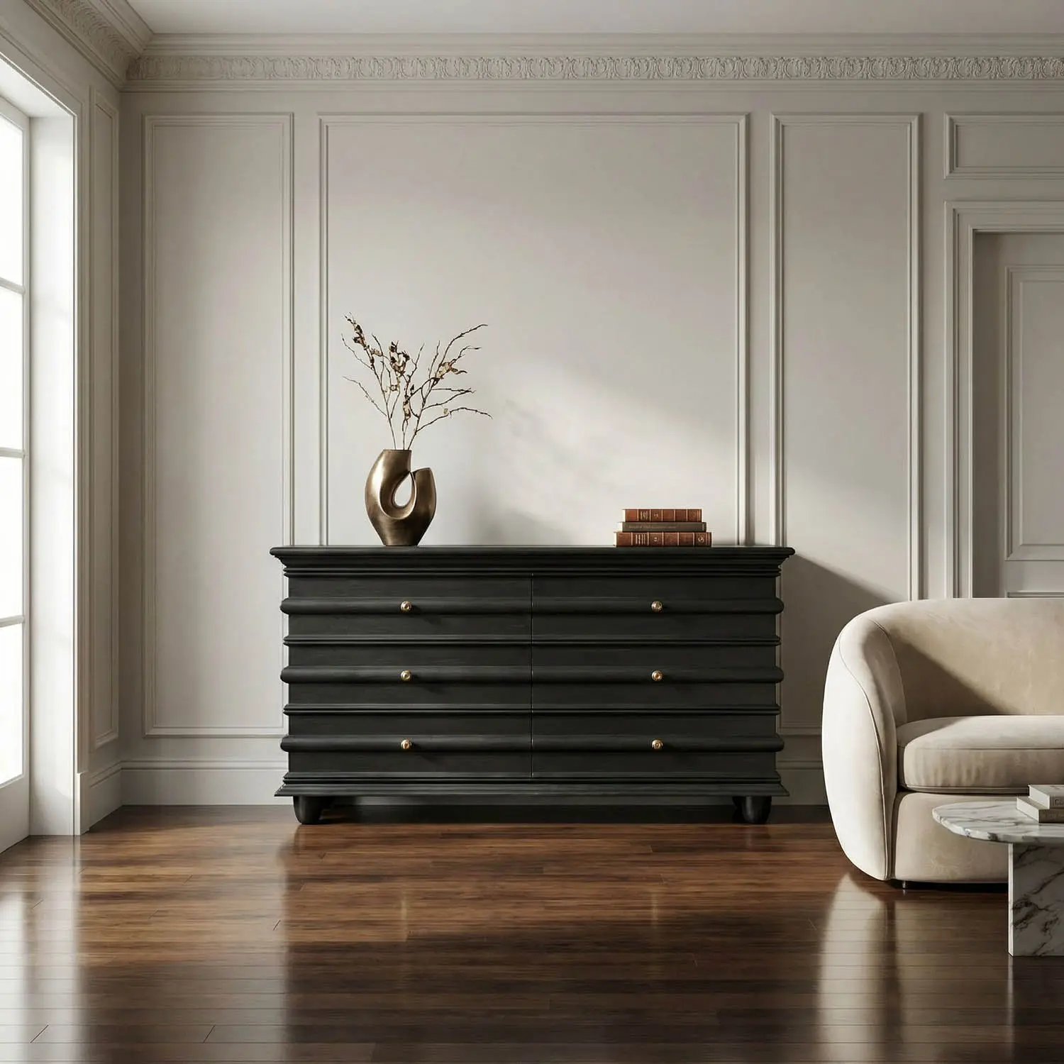 The Ascona Chest has a grounded, architectural presence. Made from mahogany in a Hand-Rubbed Black finish, it features six drawers and rests on carved bun feet with stepped detailing that subtly nods to Art Deco.