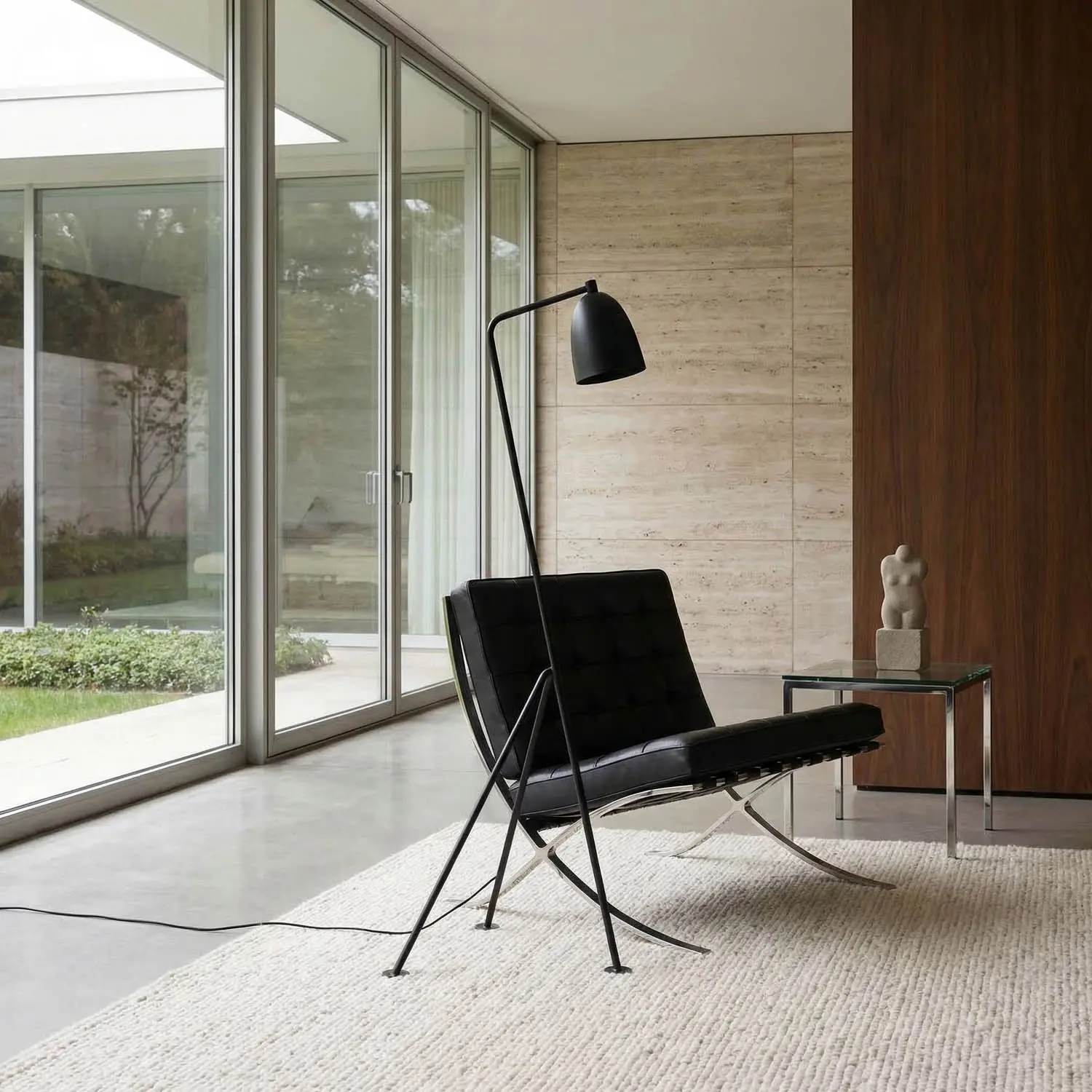 A Matte Black iron tripod floor lamp with an angled, adjustable arm and conical shade. Its clean lines and poised stance nod to mid-century design while delivering architectural lighting for modern spaces.
