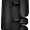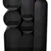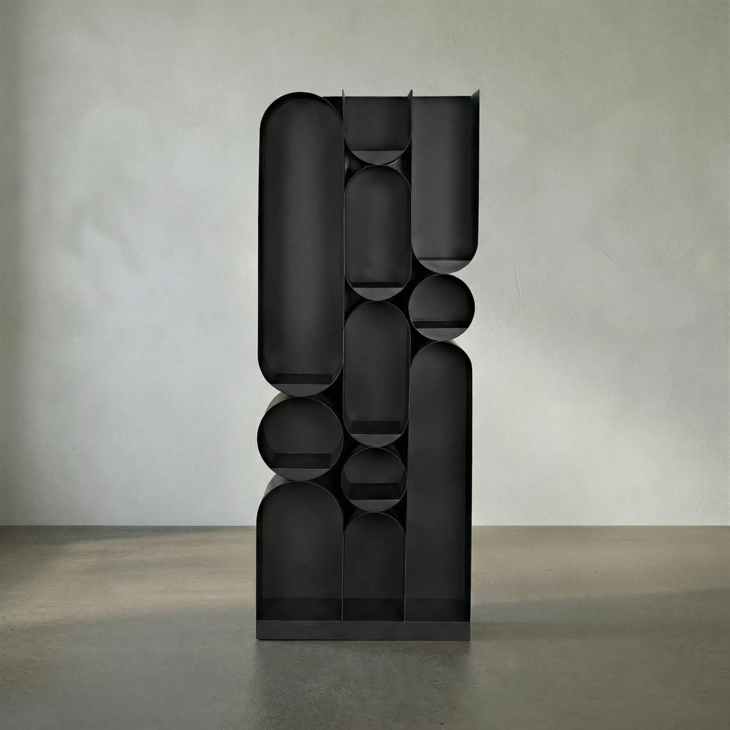 Repeating racetrack and circular shapes reminiscent of Seventies supergraphics make this iron Bookcase a sculptural and graphic storage standout. A modest width and depth make for ease of placement. Matte Black finish.