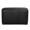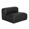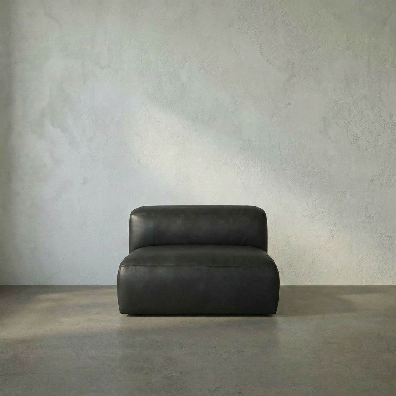 This modular armless seat features black leather upholstery, a deep, low-profile silhouette, and gently rounded edges. Its integrated strap and buckle detail enhance the design’s versatility. Ideal for modular configurations or as a versatile standalone piece.