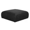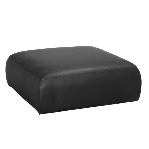 This black leather ottoman features a minimalist, low-profile cube design with soft, rounded edges. Its generous proportions and seamless design offer a clean, modern aesthetic, ideal for modular configurations or as a versatile standalone piece.