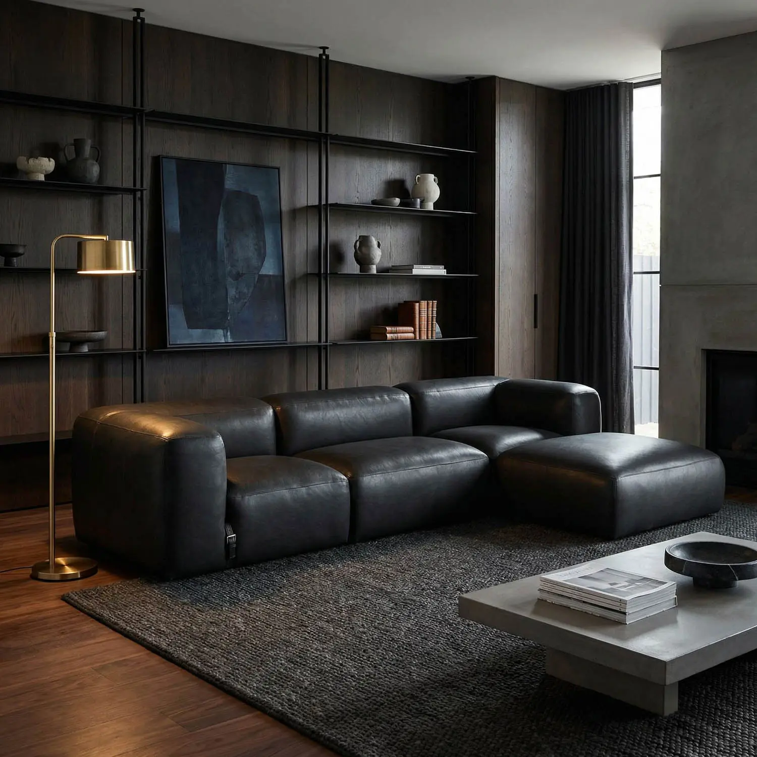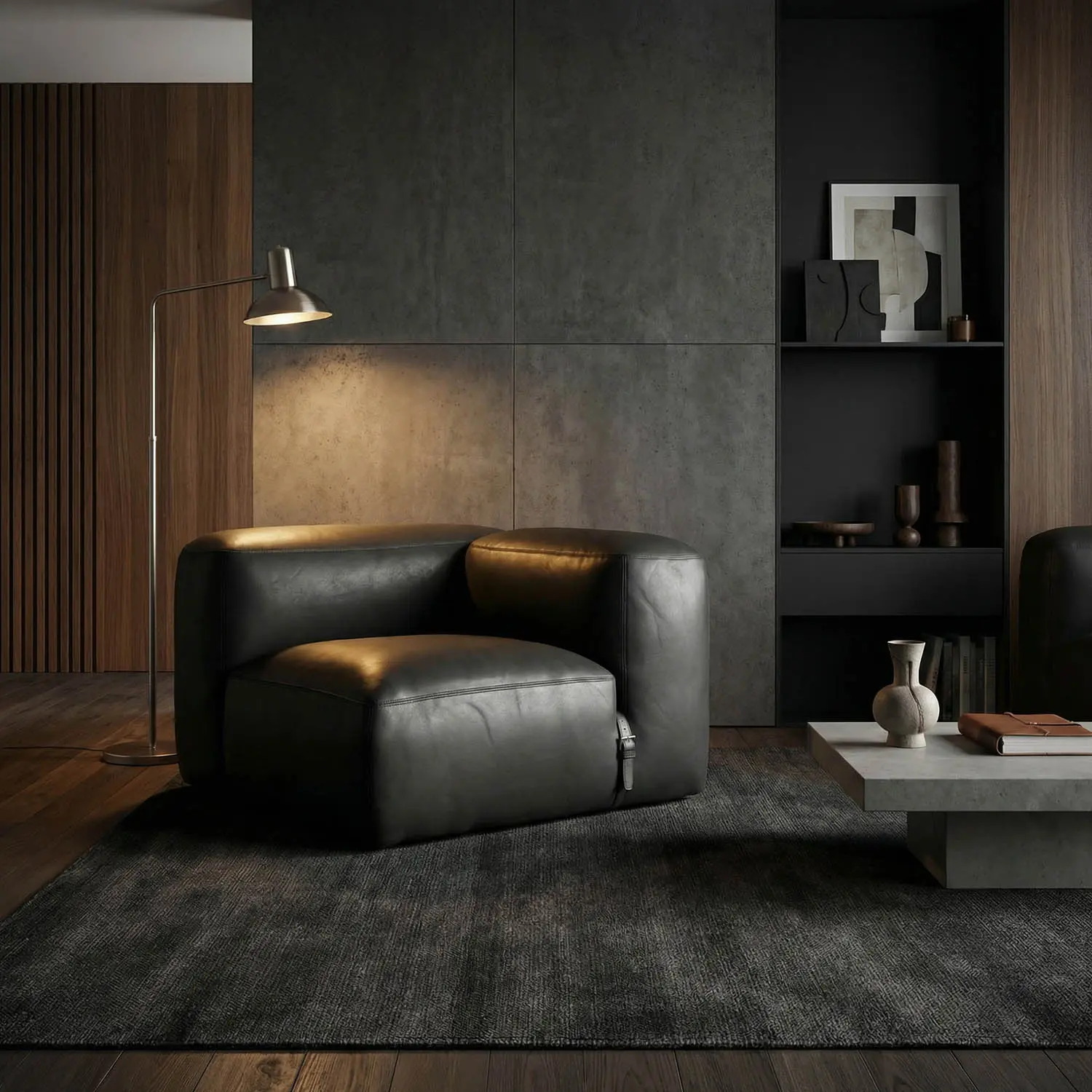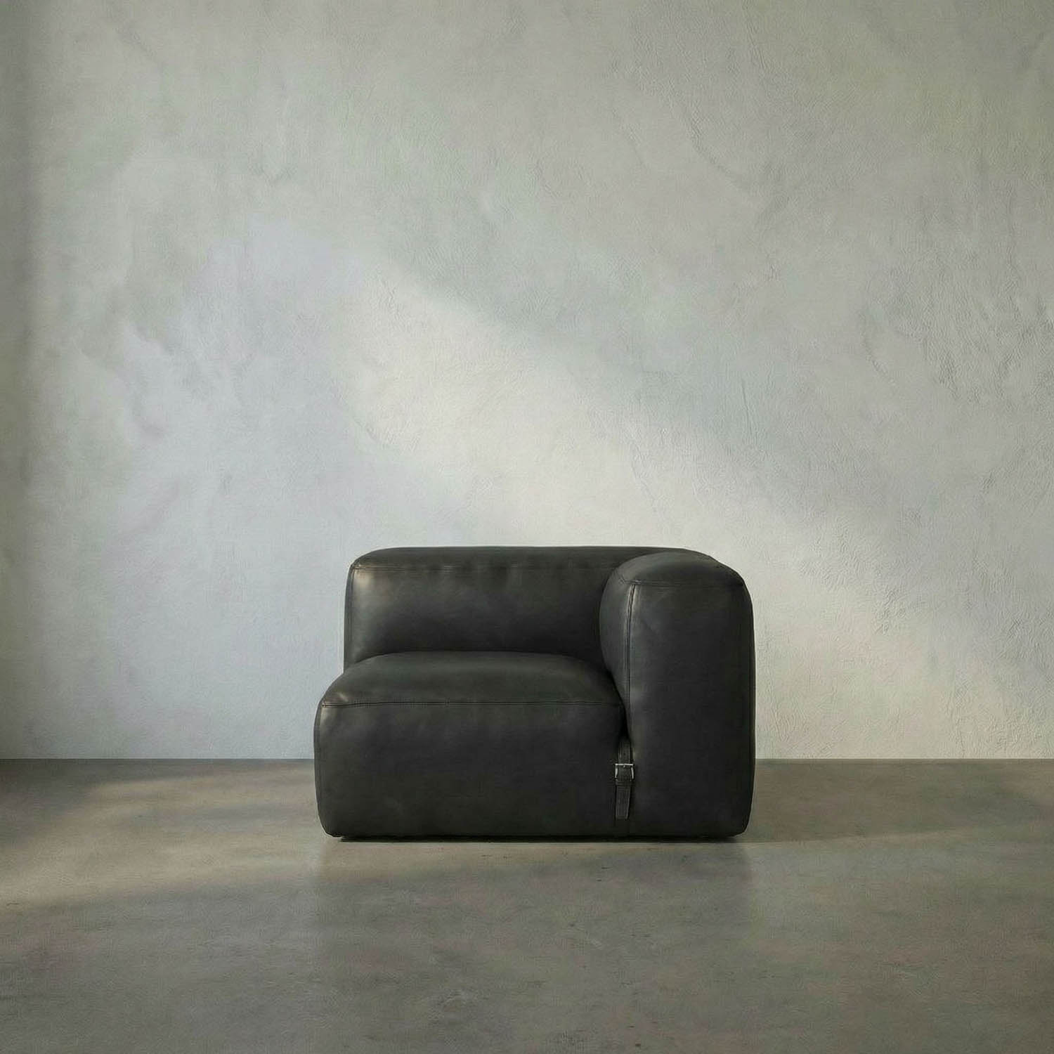 This modular armless seat features black leather upholstery, a deep, low-profile silhouette, wide armrests, and gently rounded edges. Its integrated strap and buckle detail enhance the design’s versatility. Ideal for modular configurations or as a versatile standalone piece.