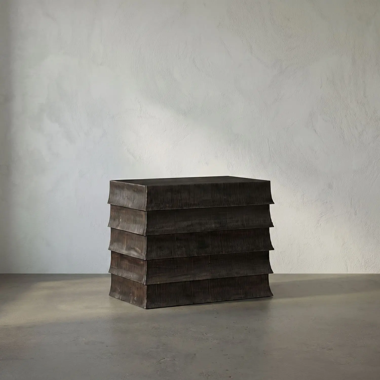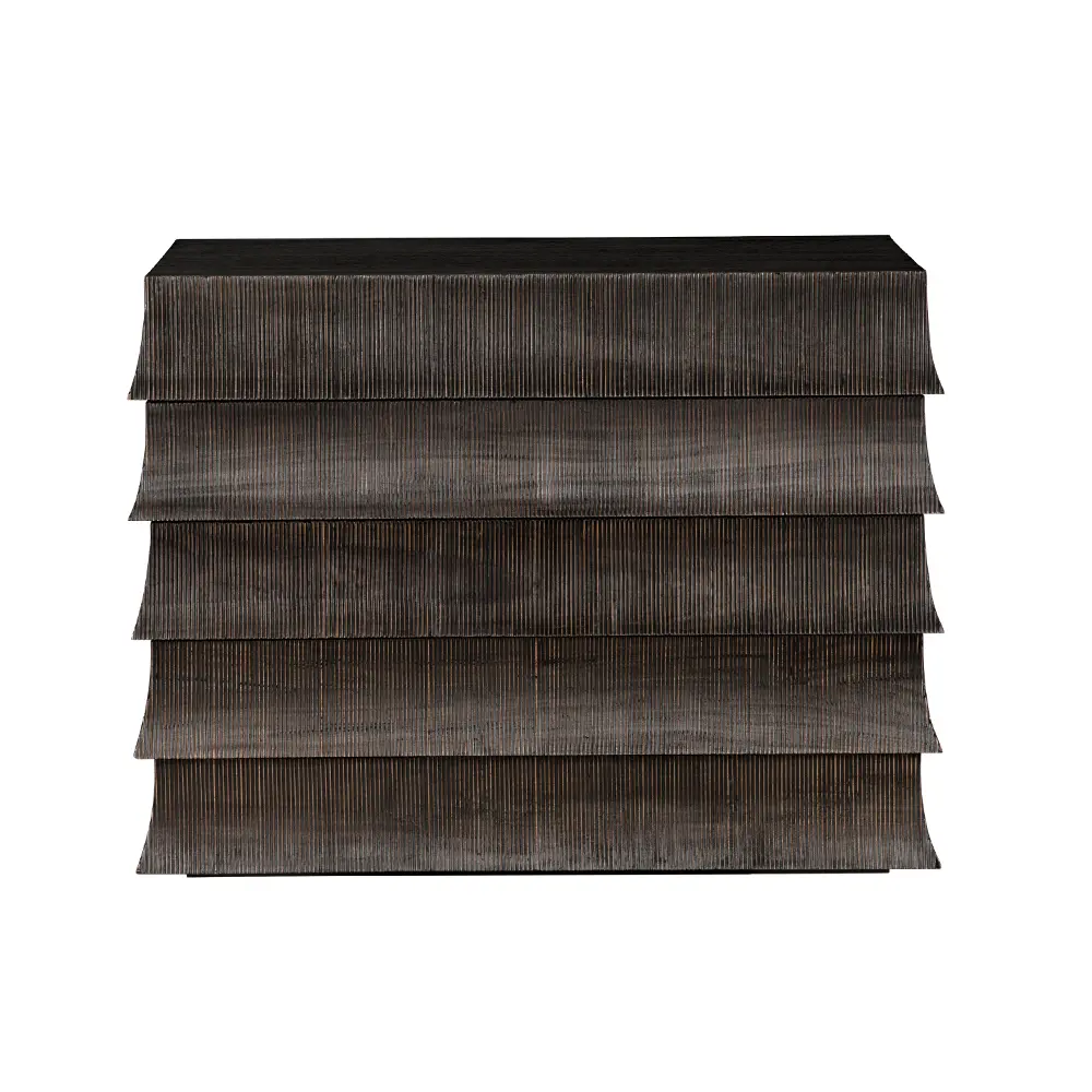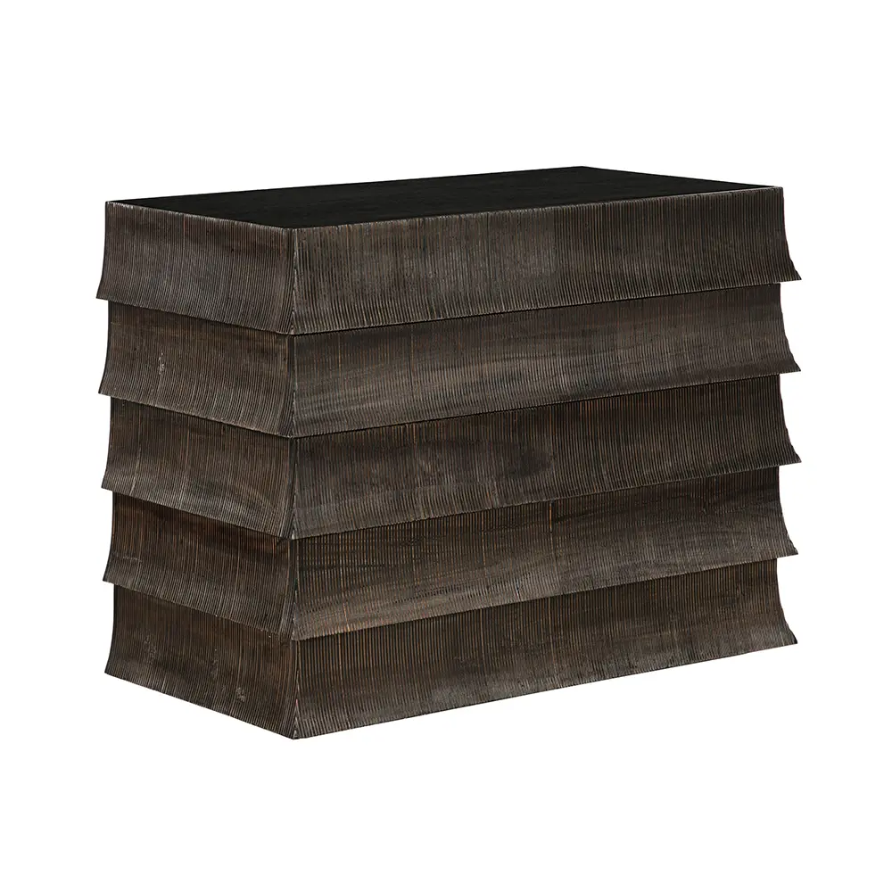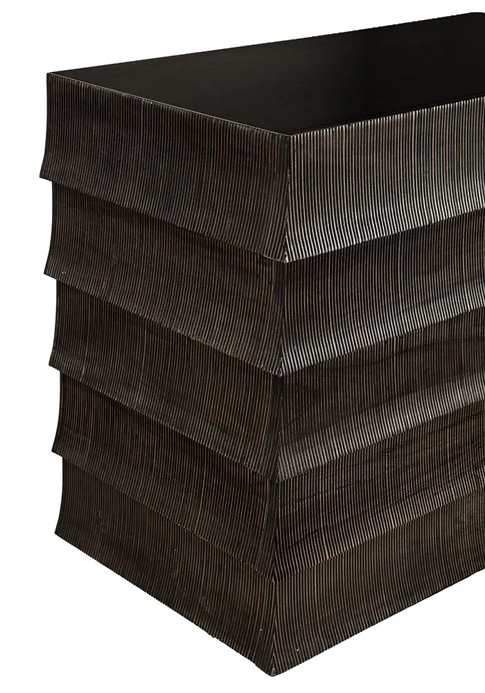 Monolithic cabinet with flared, tiered drawer fronts that echo traditional tile roofs. The brown ribbed surface, contrasting Hand-Rubbed Black top, minimal detailing, and layered design highlight materials, restraint, and modern structure over ornamentation.