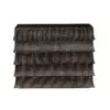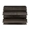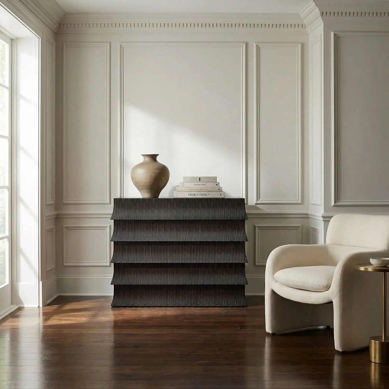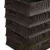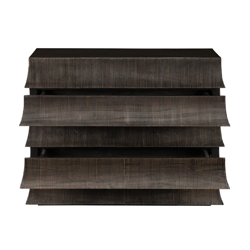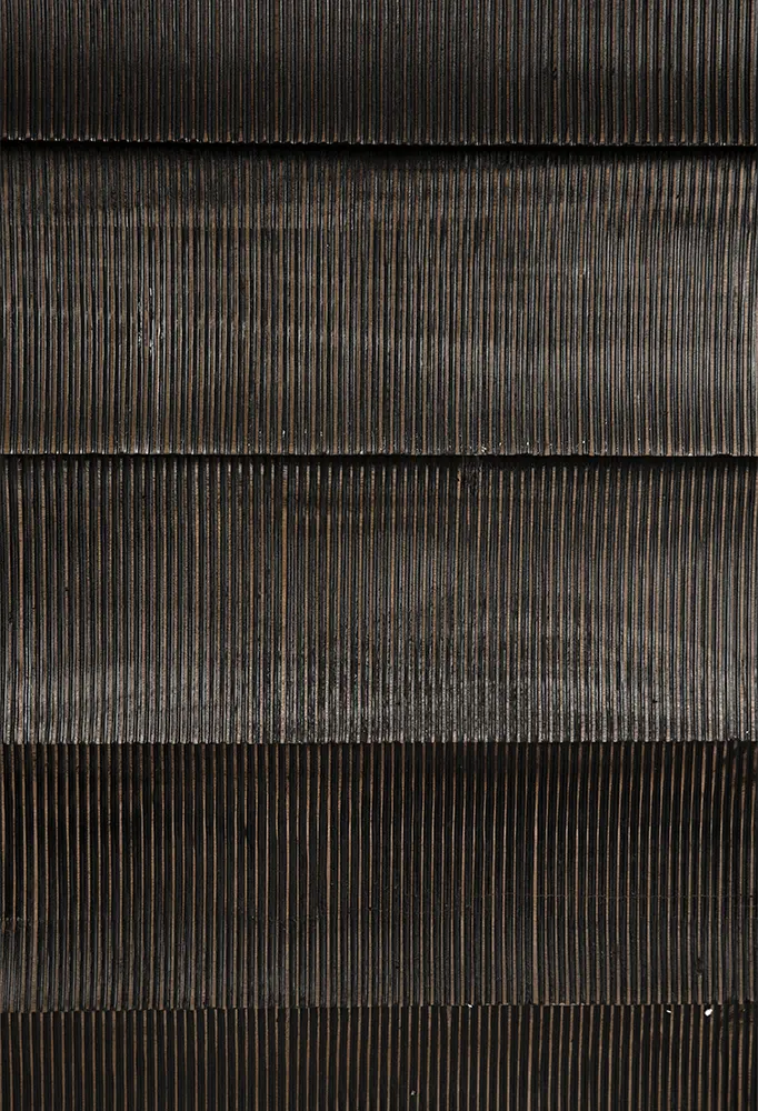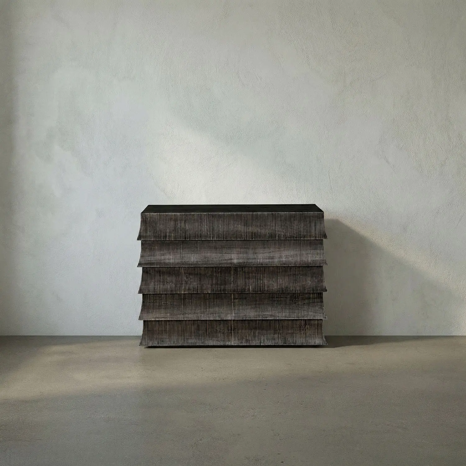 Monolithic cabinet with flared, tiered drawer fronts that echo traditional tile roofs. The brown ribbed surface, contrasting Hand-Rubbed Black top, minimal detailing, and layered design highlight materials, restraint, and modern structure over ornamentation.
