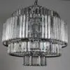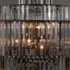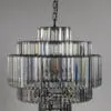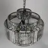 A five-tier matte black iron frame holds six bulbs surrounded by clear, peaked crystal prisms. It blends an iron structure with luminous crystal detailing–modern, refined, and impactful.