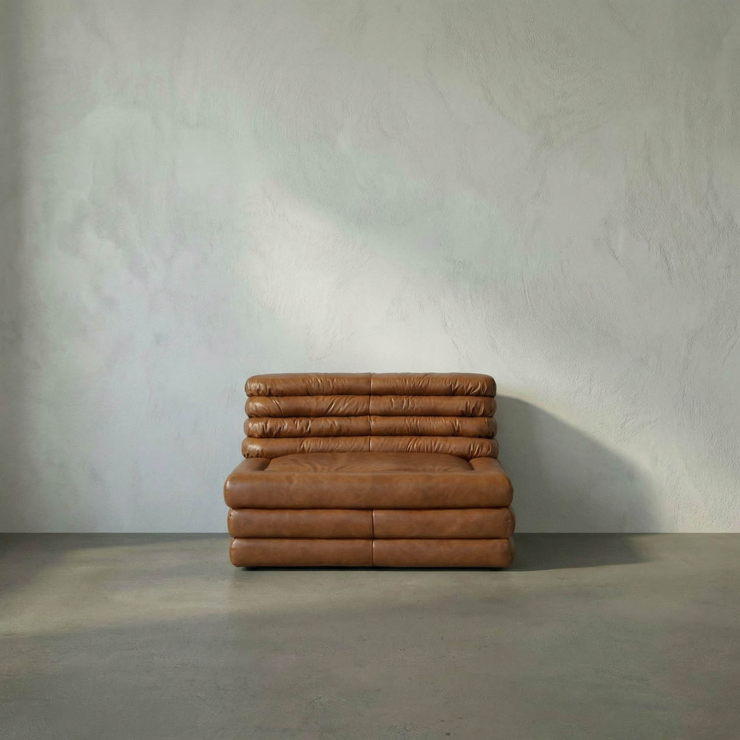 The Bandera Sofa features top-grain Roche tan leather with a sculpted, layered design and low profile. Its modular form offers flexible seating and adds a modern focal point to any living area.