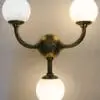 A three-light wall sconce in Antique Brass, with frosted glass globes on gracefully curved arms. Its sculptural, whimsical design adds artistic elegance to modern, transitional, or eclectic interiors.
