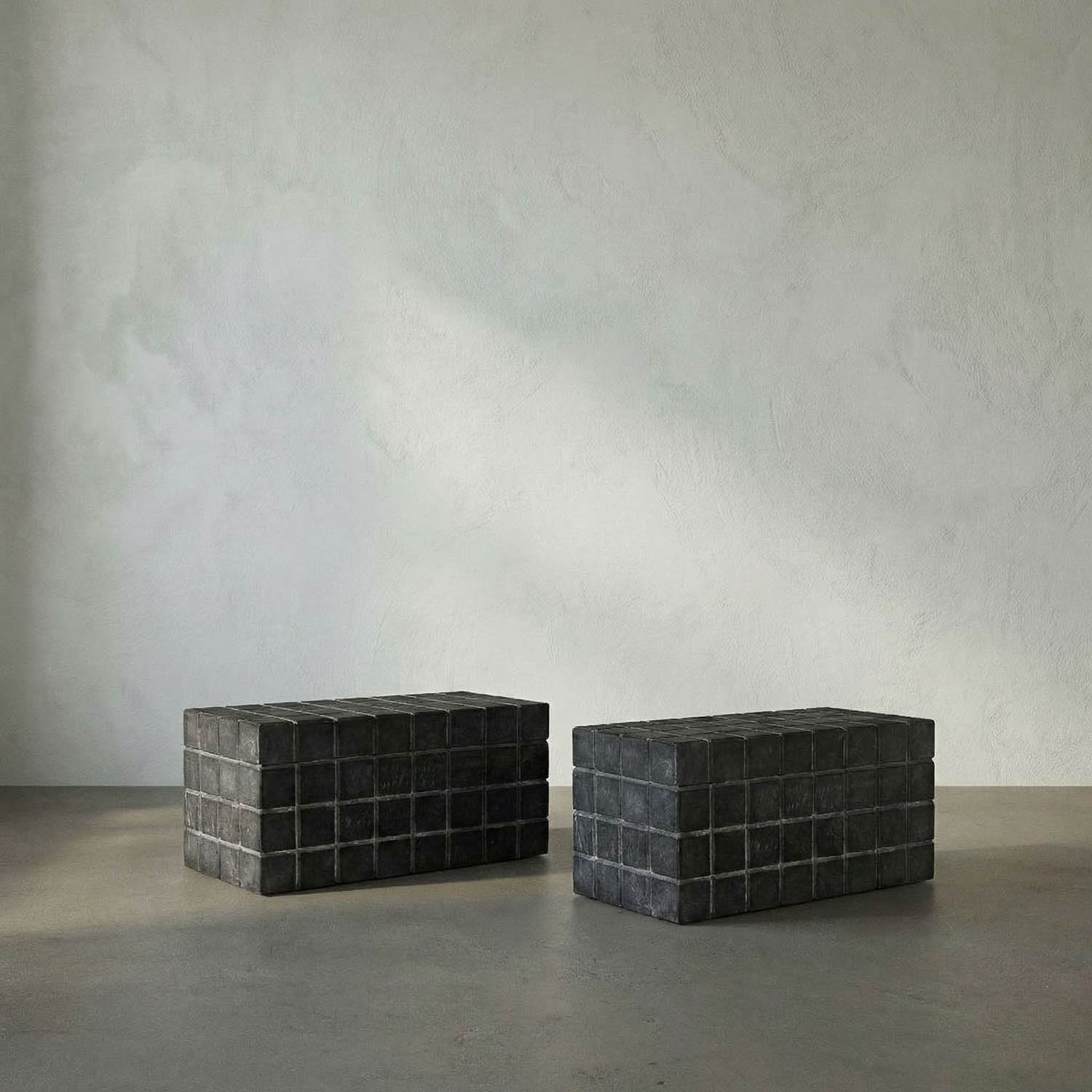 A black marble box is hand etched with a grid pattern on five sides, juxtaposing the beautiful variety of natural stone with a modern pattern–a perfect lidded catch-all for any space.