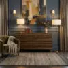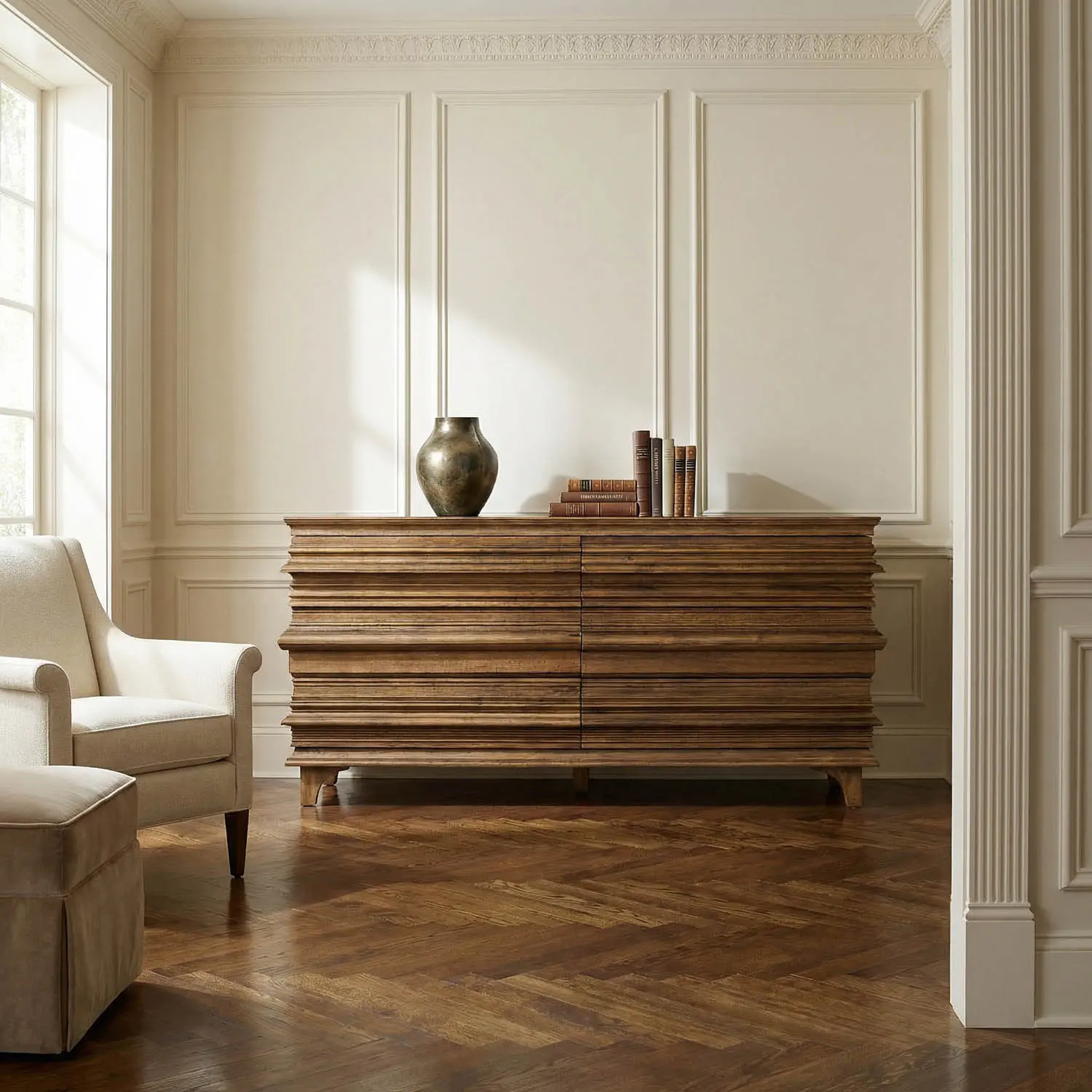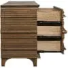 The Bernard Dresser features a layered, block-like design with six spacious drawers. Finished in Dark Walnut, its clean lines and rich color create a bold, grounded presence with subtle architectural appeal.