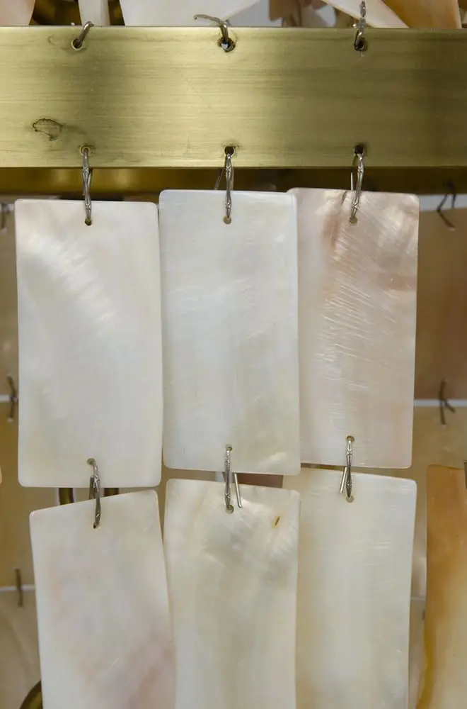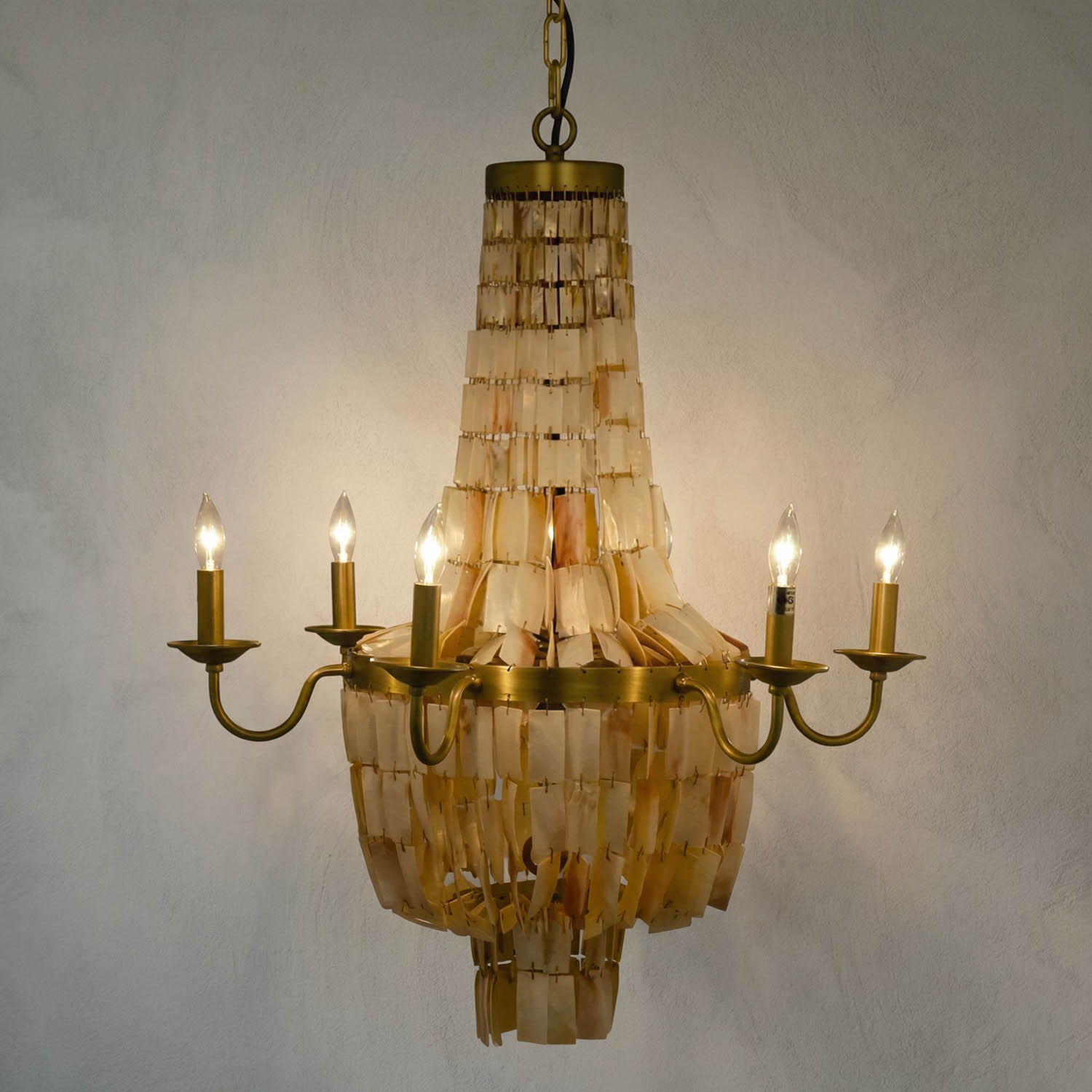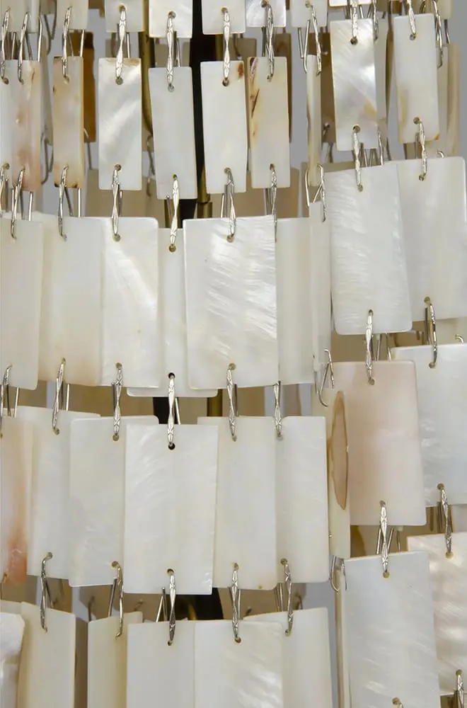 The Bijou Chandelier by Noir combines antique brass metalwork with natural shell elements, creating a luxurious, bohemian-inspired centerpiece.