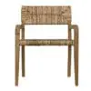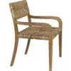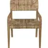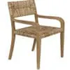 A teak armchair with softly curved arms adorned with expertly hand-woven seagrass is elegantly designed to enhance the beauty of its natural materials.