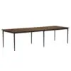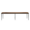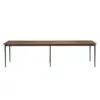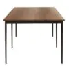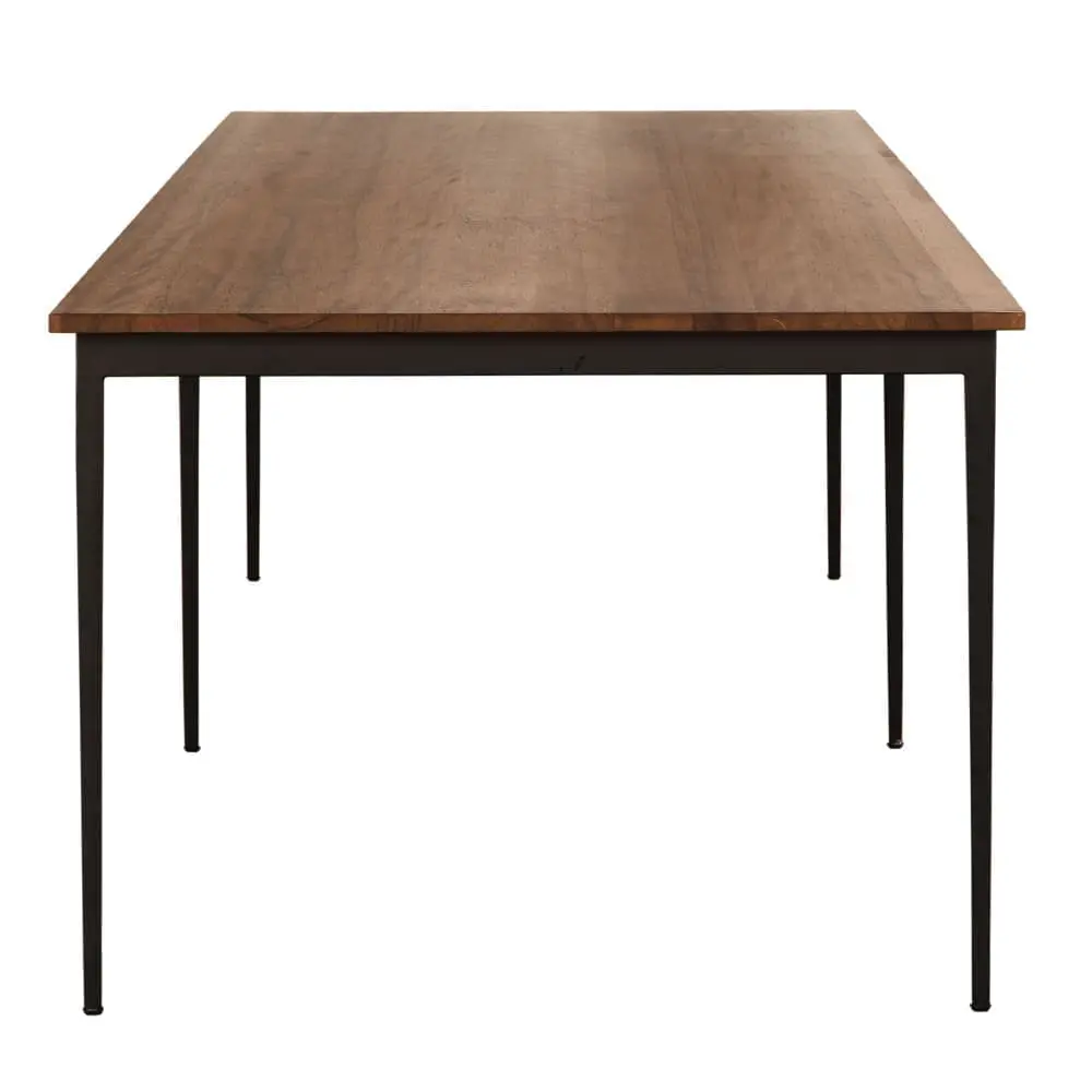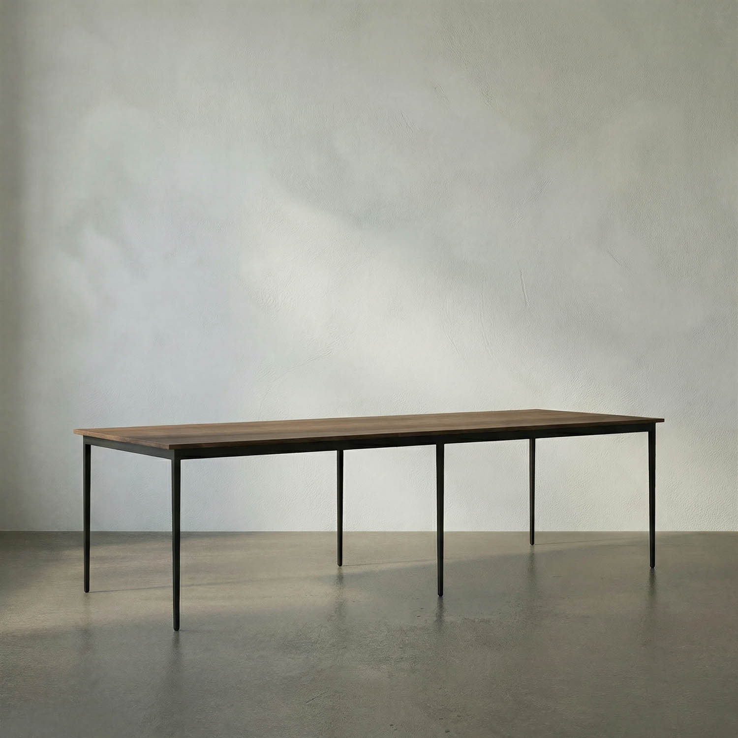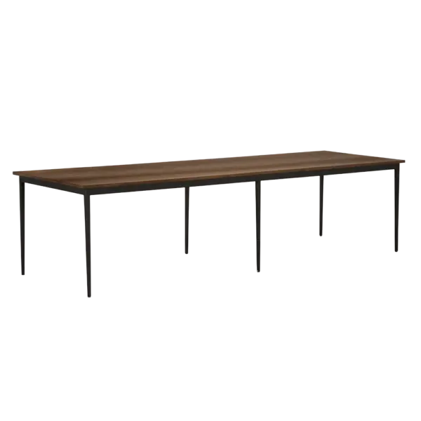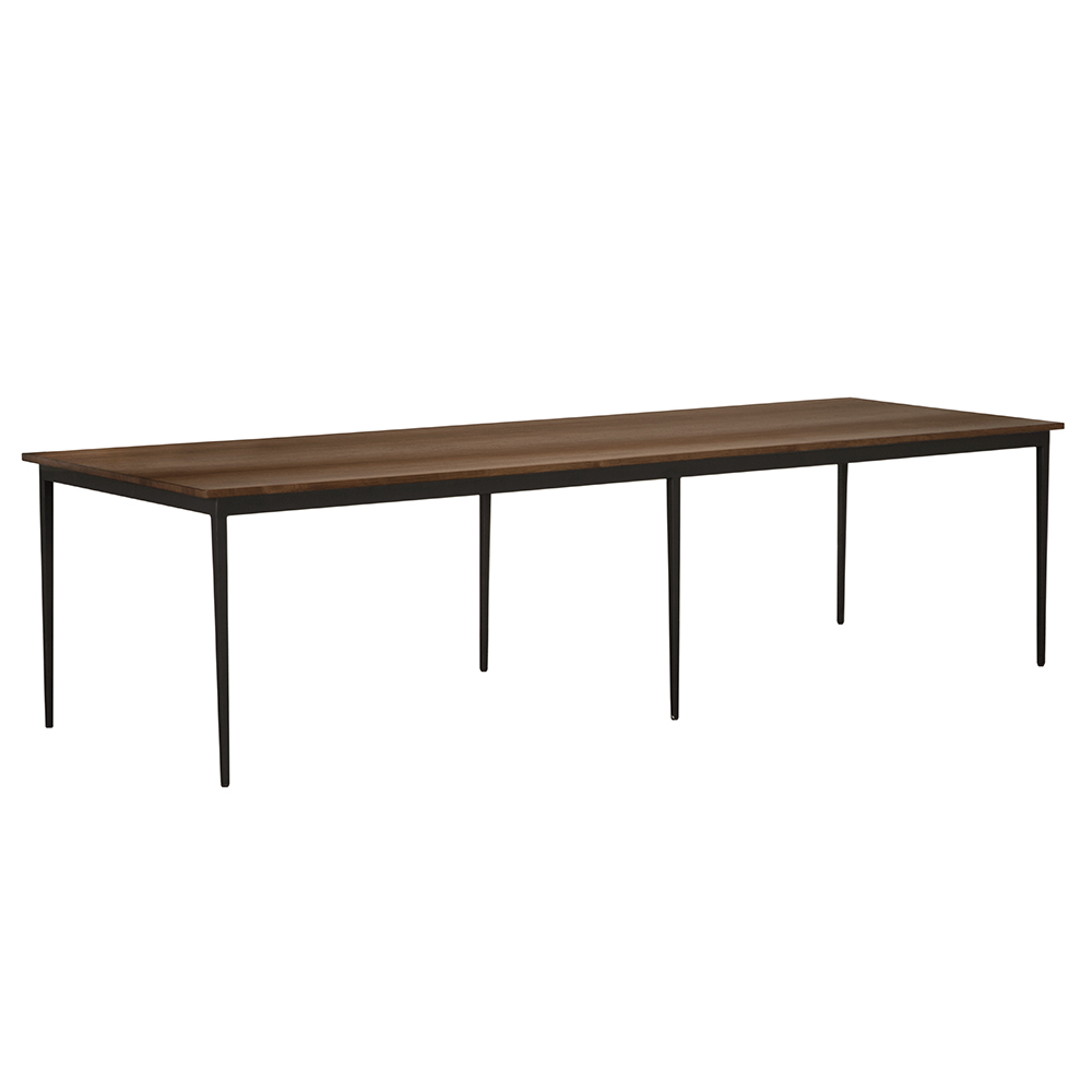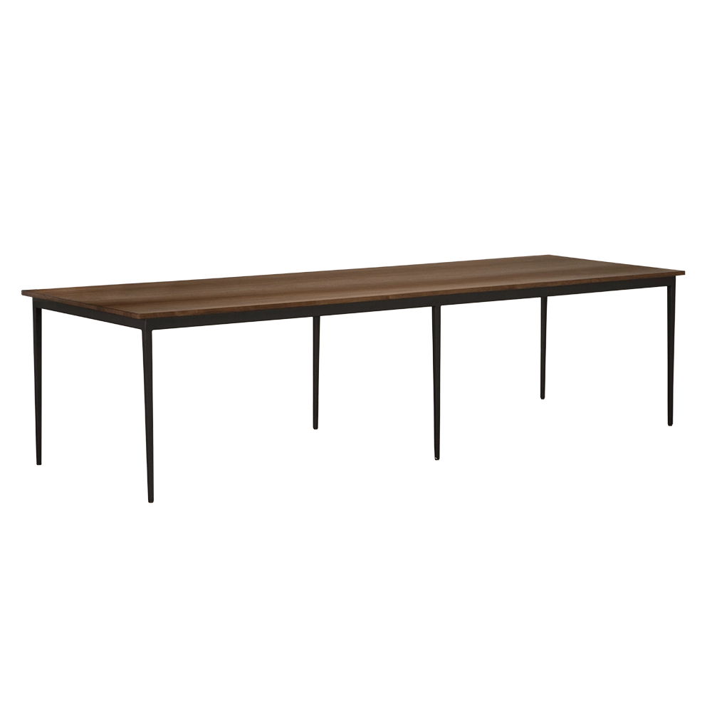 This dining/conference table features a sleek solid walnut top paired with slender black iron legs. Its minimalist profile and refined proportions create a versatile piece that transitions seamlessly between modern dining settings and professional workspaces.