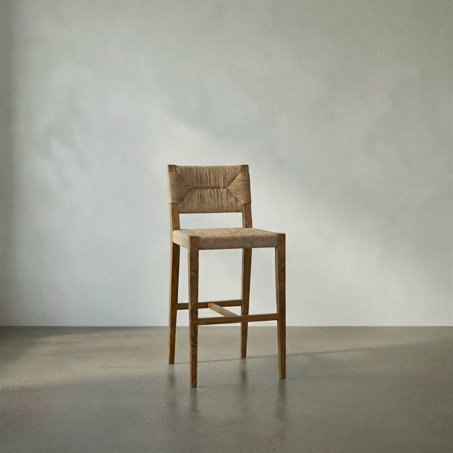 A tapered-leg counter stool pairs a teak frame with a classic, twisted, multi-ply Danish cording seat and back.