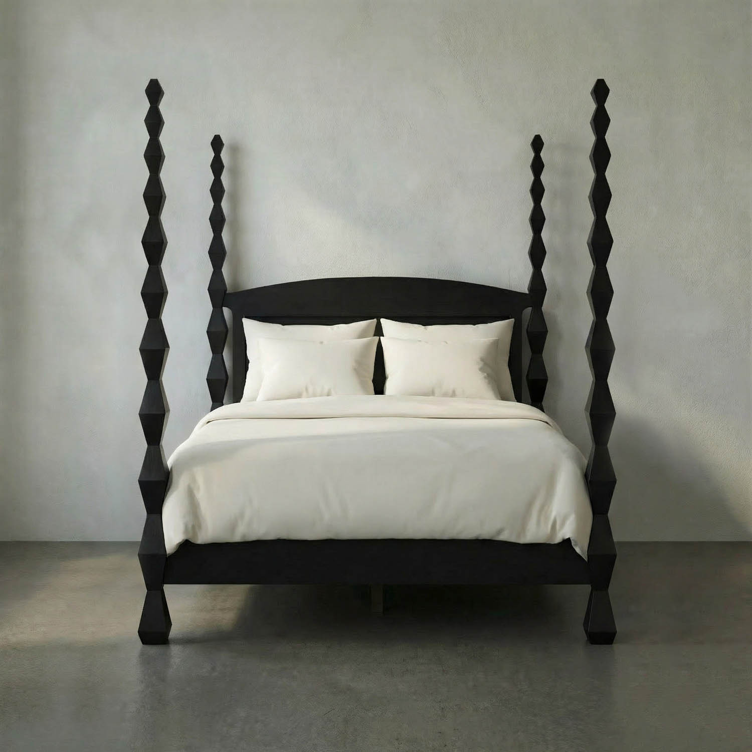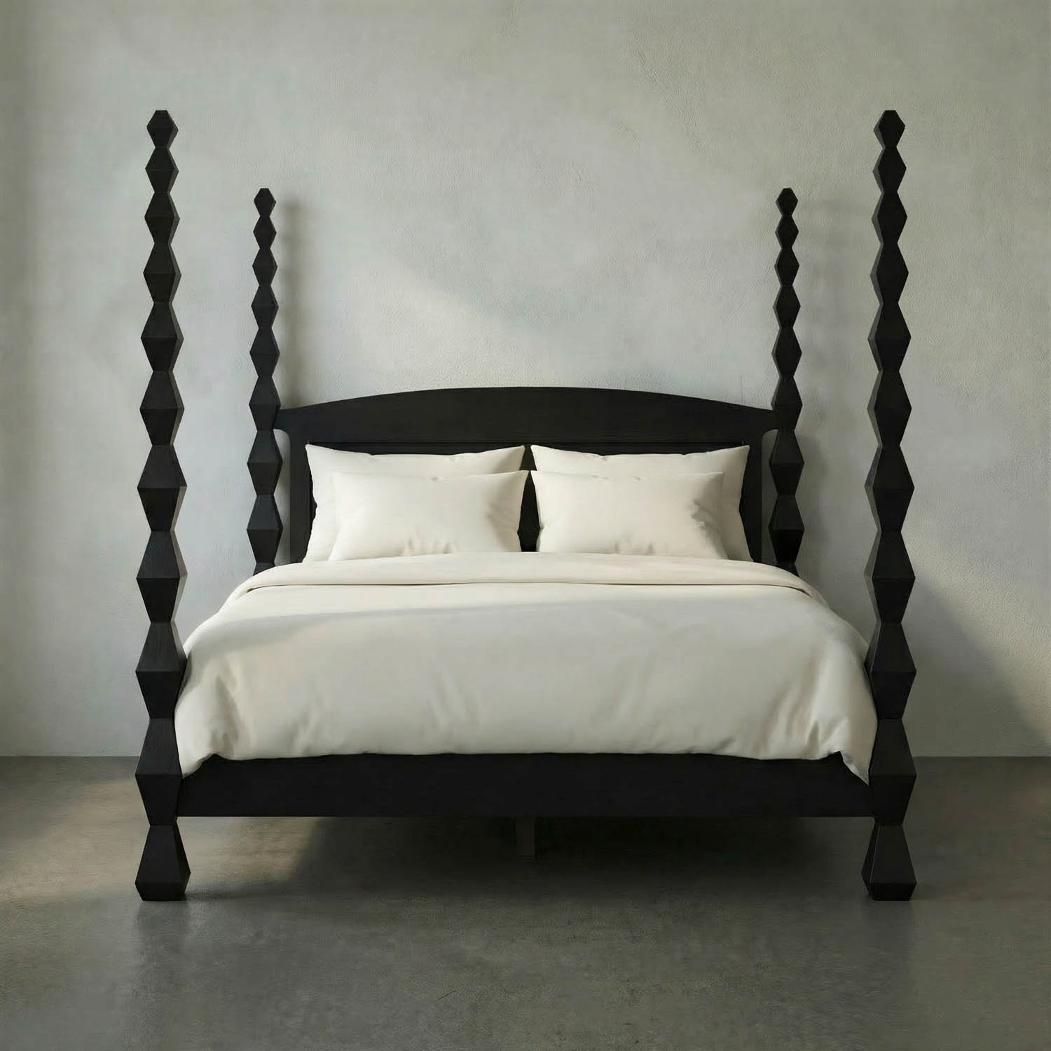 Inspired by the patriarch of modern sculpture, the Brancusi four-poster bed features a dramatic geometric totem hourglass post design in our rich Hand-Rubbed Black finish–a statement in any bedroom.