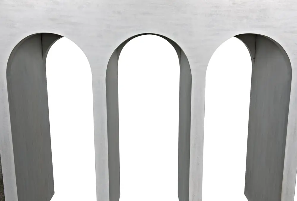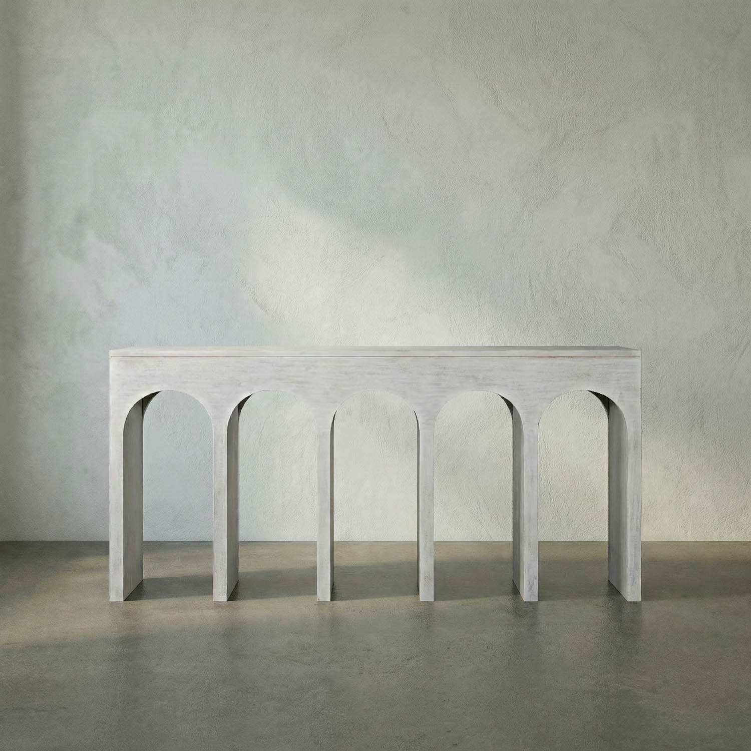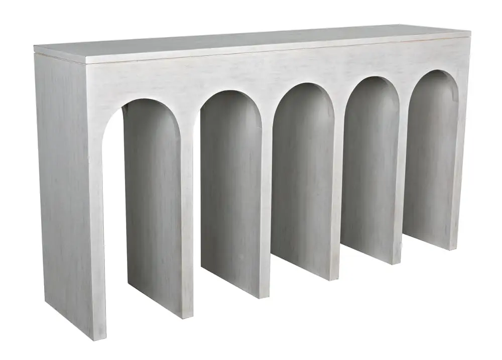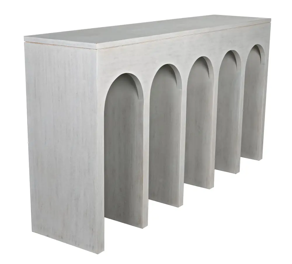 The Bridge Console draws inspiration from Roman aqueducts, featuring six evenly spaced arches that form a striking sculptural base. Finished in our White-Wash, it blends architectural heritage with modern minimalism.