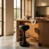 This industrial-style counter stool has a bold cylindrical shape, featuring a cushioned dome seat, a tubular metal column, and a circular footrest reinforced by radial supports.