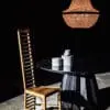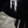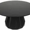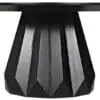 A round mahogany dining table in Hand-Rubbed Black features a flared pedestal base with scalloped detailing. Designed for modern and transitional spaces, it serves as a striking sculptural centerpiece while providing ample legroom.