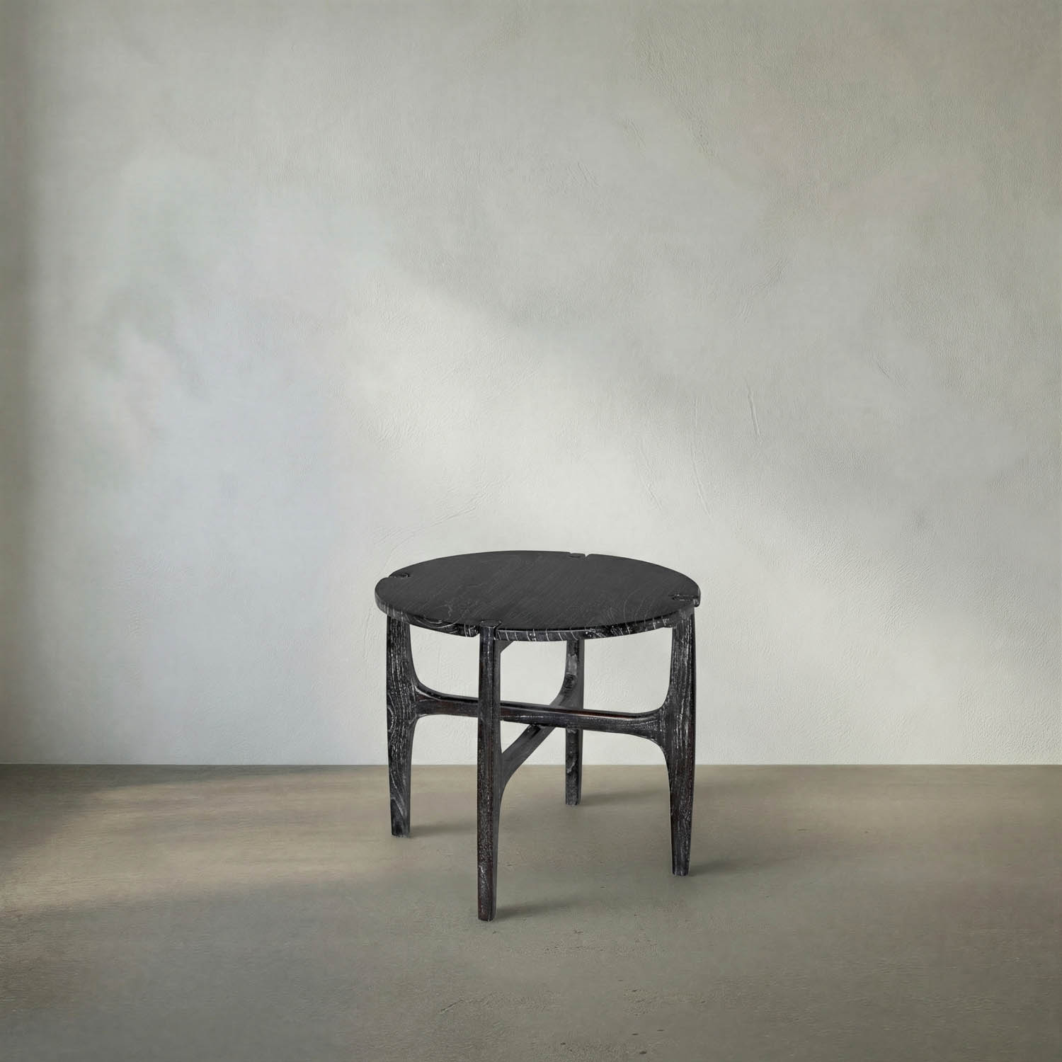The Bucks Coffee Table, featuring a round design in our Sombre finish, showcases subtly curved legs and connecting crossbars. Its minimalist silhouette and visible wood grain create a refined, organic modern aesthetic.