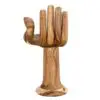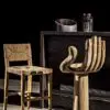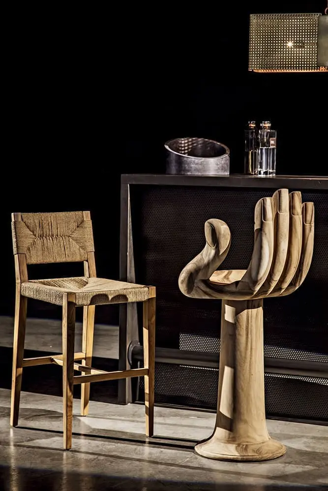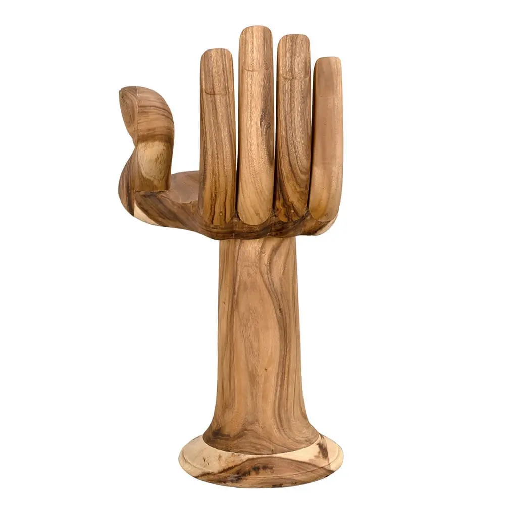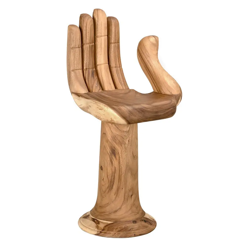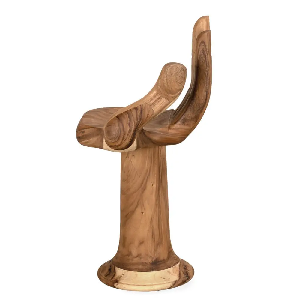 Crafted from teak, the Buddha Counter Stool showcases a graceful design inspired by a Buddha hand, highlighting the natural wood grain. This functional piece both sculptural charm and organic warmth to any space.