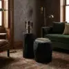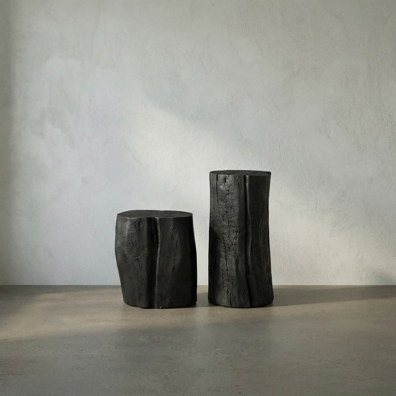 A set of two side tables made from Natural Munggur tree trunks and finished in our Japanese-inspired organic Burnt Black finish. As with all natural materials, each set is unique, and sizing will vary. Indoor use only.