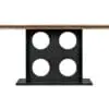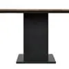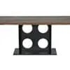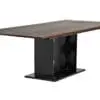 The Cameron Table showcases a rectangular Dark Walnut top paired with a Matte Black iron base featuring angular trestle-style supports, merging industrial strength with modern sophistication for a striking presence.