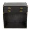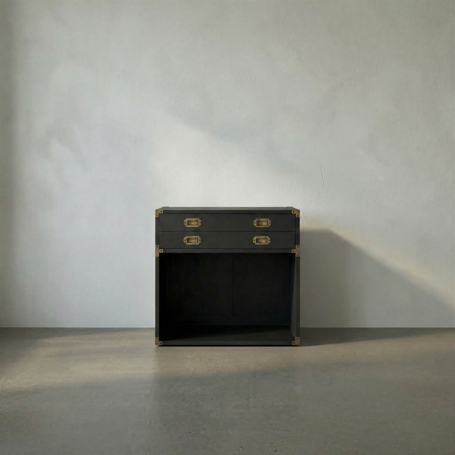 Compact campaign-style chest with clean lines, three drawers, and brass hardware; mahogany finished in pale stain highlights the natural grain, blending traditional form with contemporary minimalism for refined interiors.