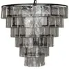 The Carnegie Chandelier features a six-tiered black iron frame draped with rectangular glass pailletes. Compact yet striking, it blends industrial structure with vintage-inspired charm.