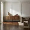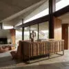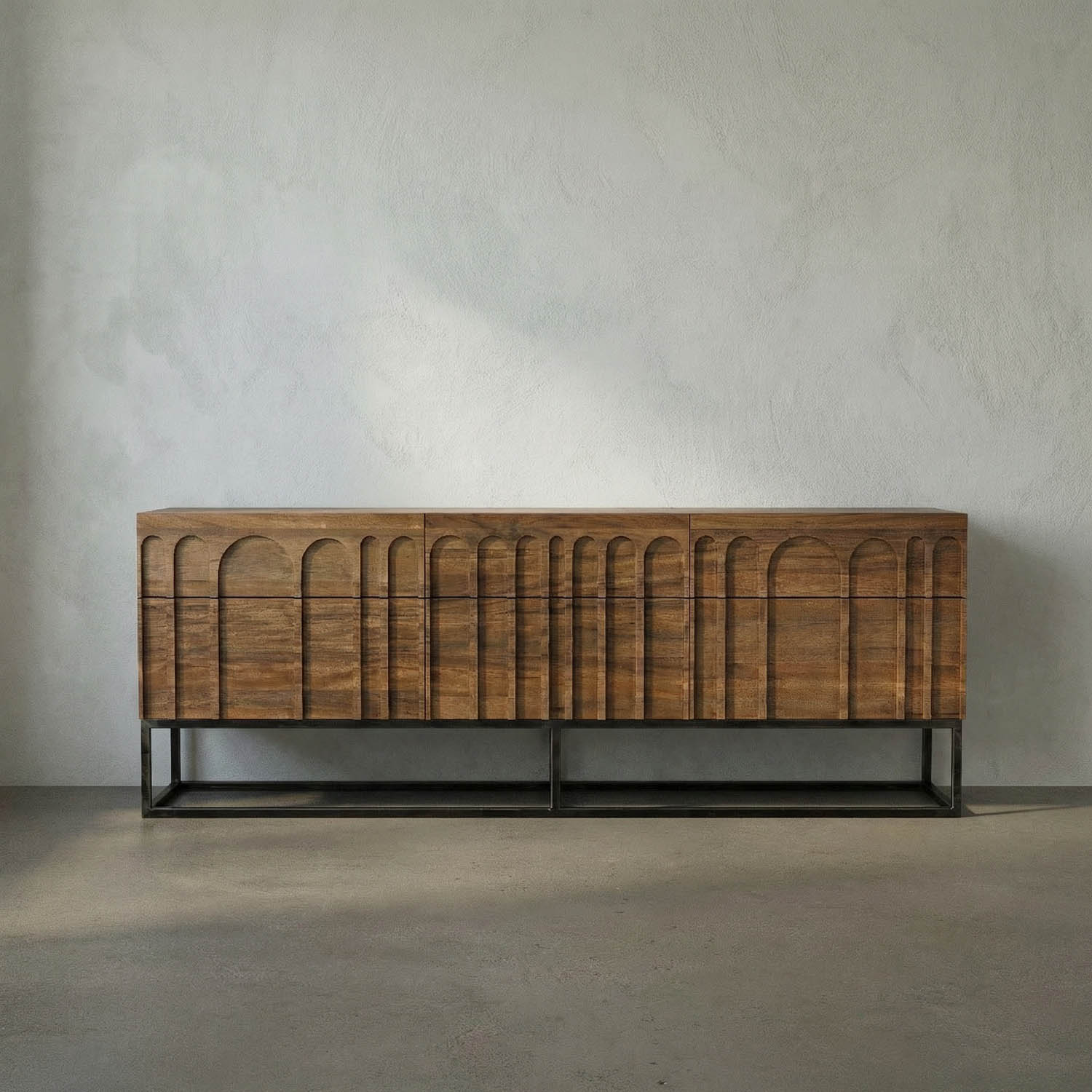 The Casanova Sideboard features a body stained in Dark Walnut, paired with a minimalist matte black iron base, creating a sleek appearance. With its extended low profile and varied carved arches, it provides ample concealed storage, making it both a striking and functional anchor.