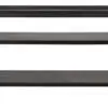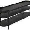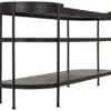 This three-tier Cassio Console features a sleek black metal frame with rounded ends and slim legs. Its open shelves and minimalist design offer a light, airy feel with industrial sophistication.