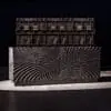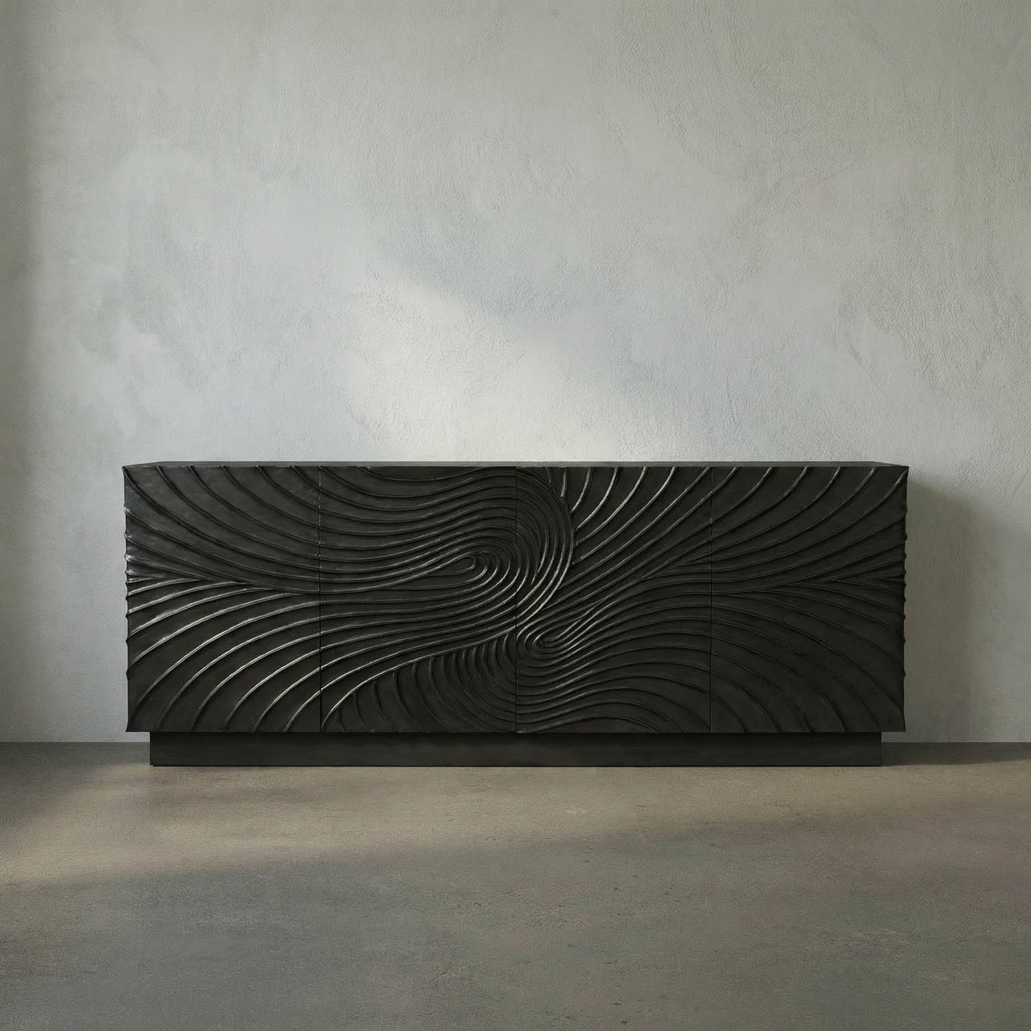 The Cavalier Sideboard features four intricately carved doors in a striking, geometric pattern, made from mahogany in our warm, Pale finish. Its substantial design and tactile texture add a sculptural element to dining or living areas.