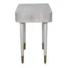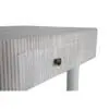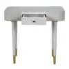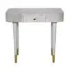The Celine Desk/Vanity is a smaller-scale piece that features a fluted or ribbed top with rounded corners, one drawer, and tapered legs with brass-capped feet. The White Wash finish adds a casually distressed appearance, making it a versatile standout.