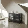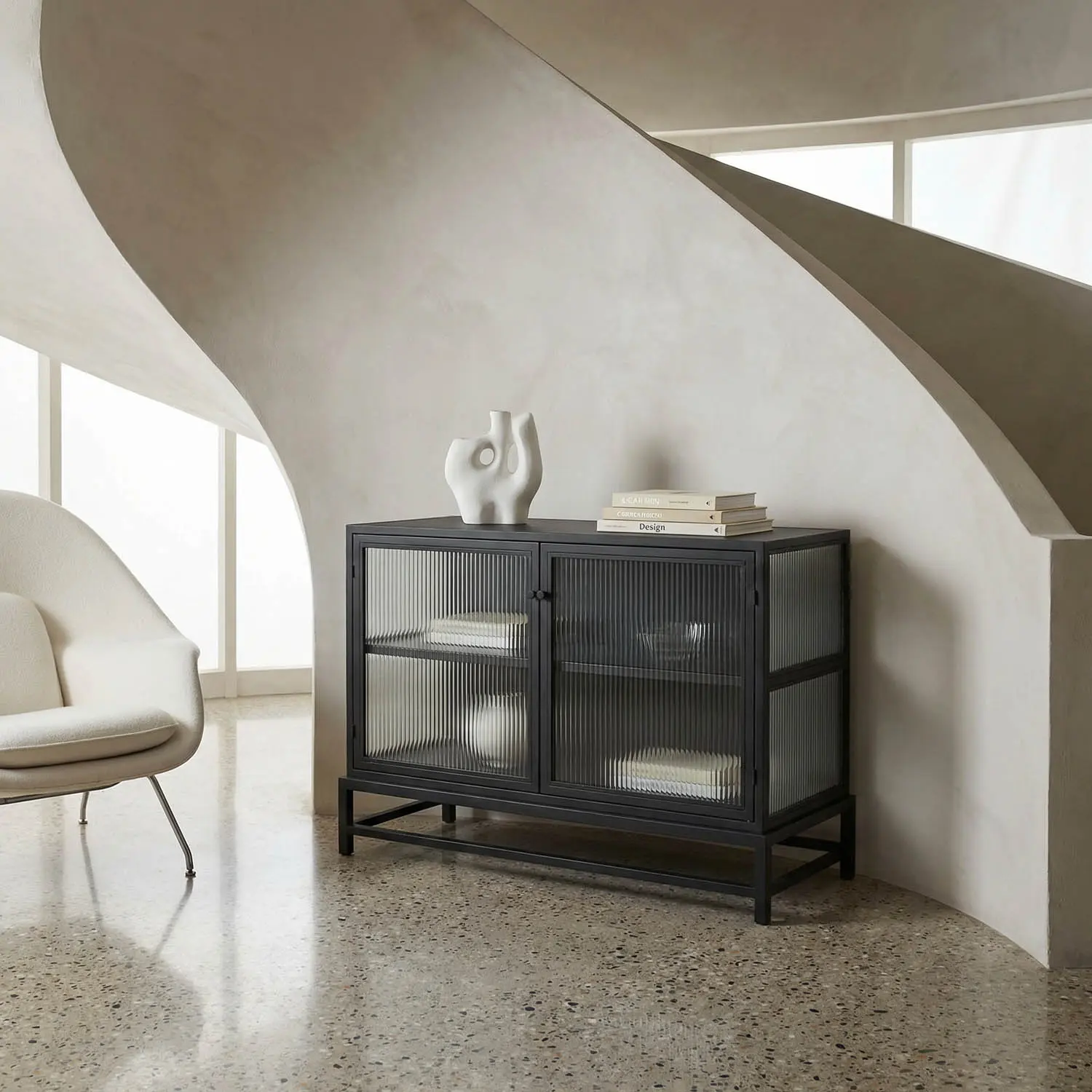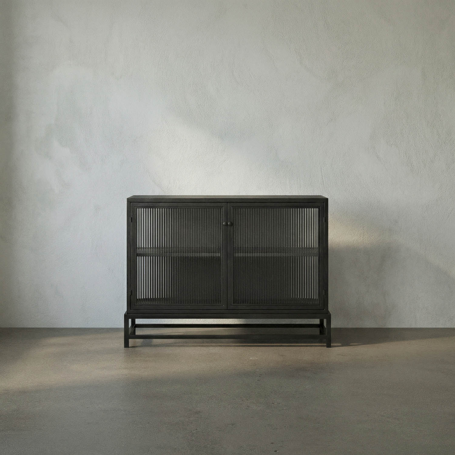 The Chandler 2-Door Sideboard features a minimalist industrial design, crafted from matte black iron-framed channeled glass doors. Its clean lines and compact form make it ideal for modern spaces, while the interior shelving offers practical and ample storage.