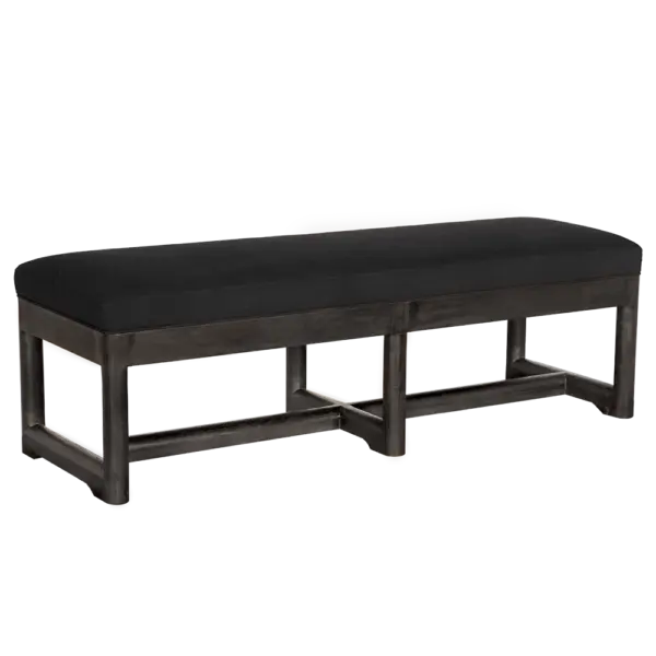 This bench features a black cotton cushion upholstered on a Burnt Black wood frame. The geometric open-leg base, complete with cross-supports, provides structural clarity by blending traditional joinery influences with a clean, modern silhouette that is ideal for transitional spaces.