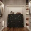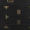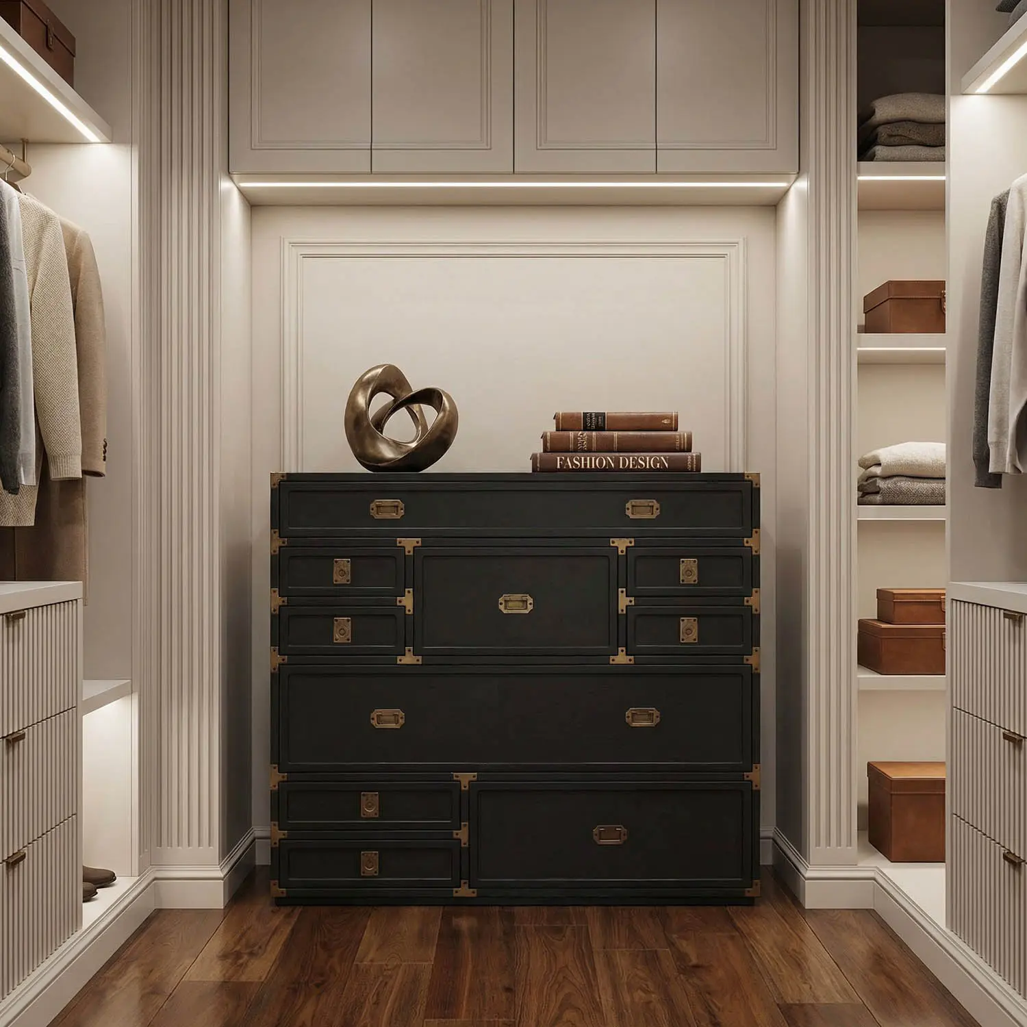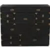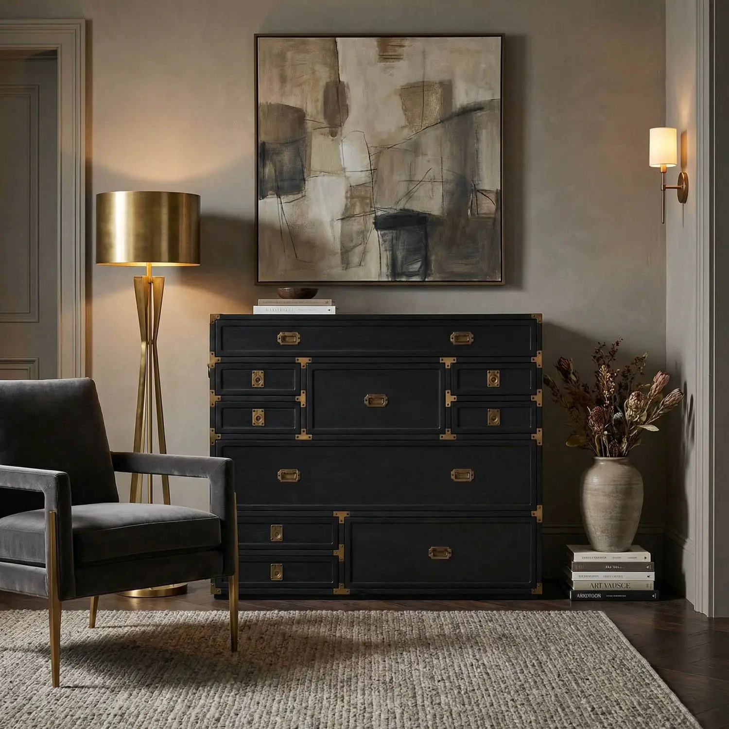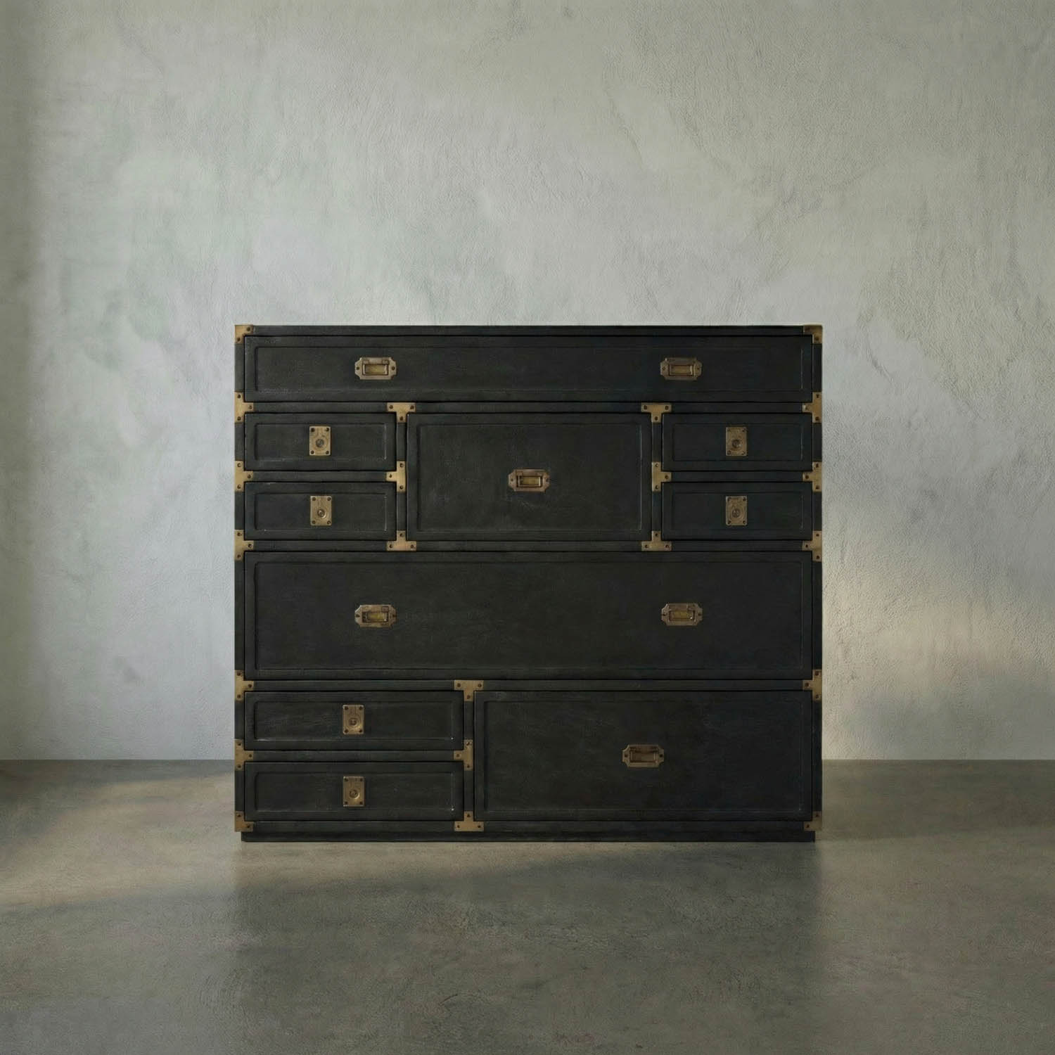 The Charles Chest features ten drawers with clean lines and antique brass hardware. Its Pale Finish blends classic campaign style with modern elegance for versatile and refined storage.
